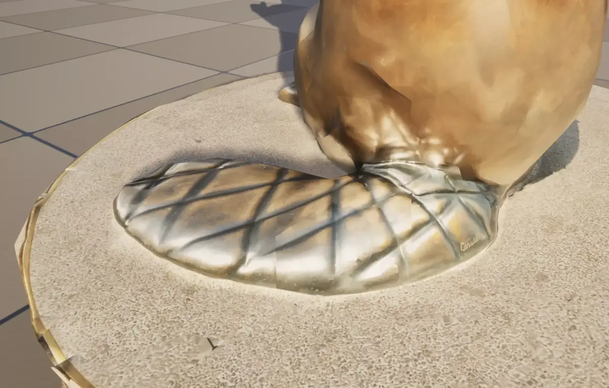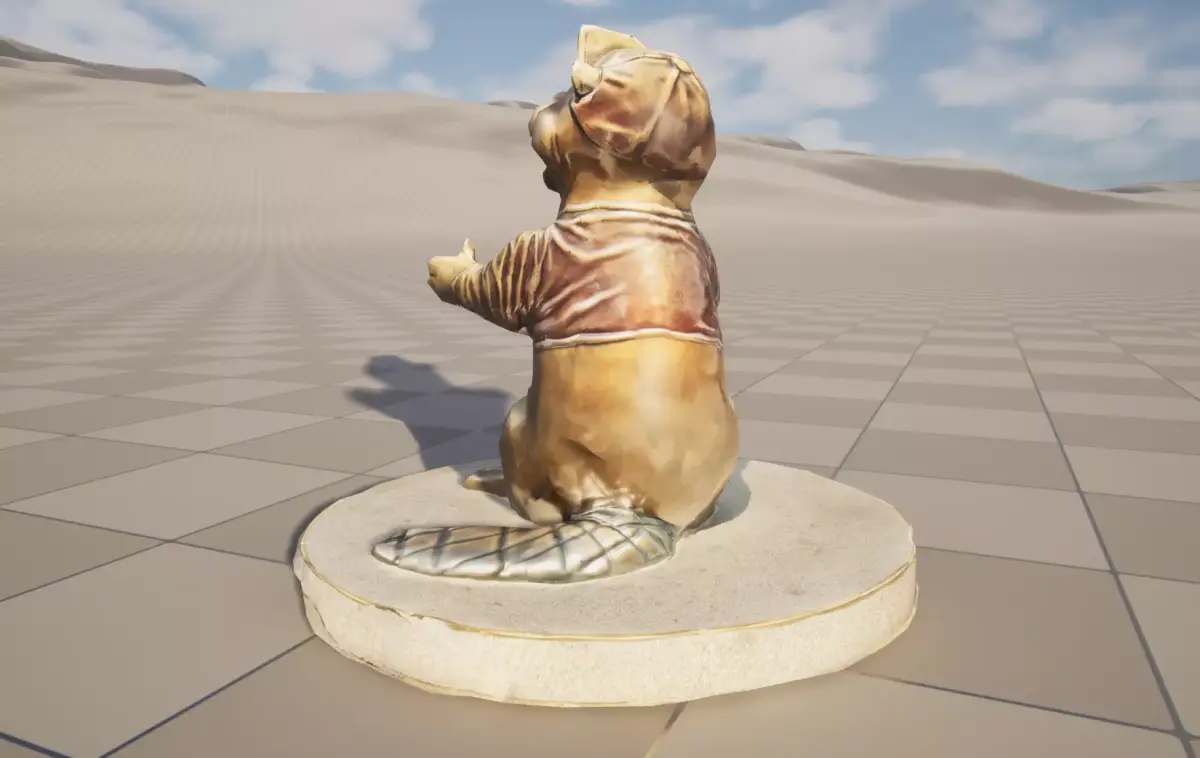 This 3D model represents a cartoon-style beaver mascot statue, complete with a baseball cap, a logo on its shirt, and a textured beaver tail. The model is ideal for game design, AR/VR experiences, 3D printing, and digital artwork.