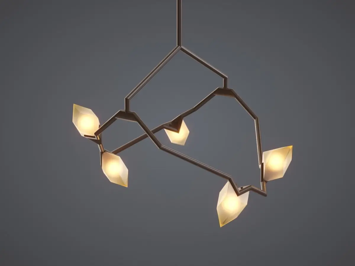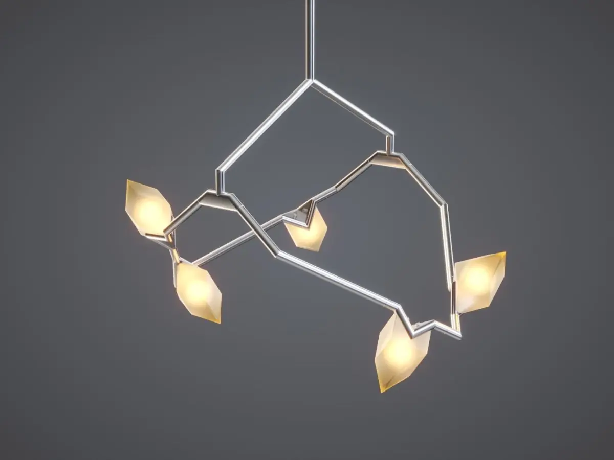 Seed 02 chandelier by Bec Brittain. Lighting fixture dimensions are: 88 x 69 x 68 cm (35 x 27 x 27 inches). Bulbs: 5 x 25 watt. Total luminous output: 550 lumens. Colour temperature: 2700 K. Max file for Corona renderer has accurately setup lights accordingly to aforementioned specs. Max file for Scanline has point helpers in place of lights, that lets you to place your own lights without hassle. FBX and OBJ files has no light objects. Light fixture comes with 3 distinct materials: golden, polished chrome and painted metal.