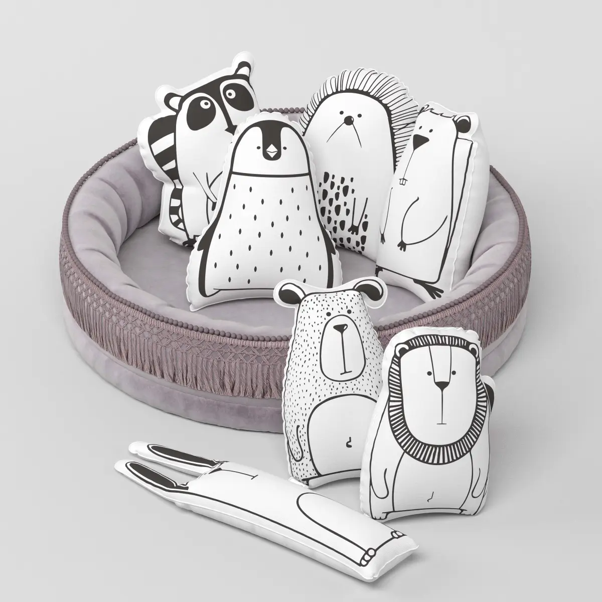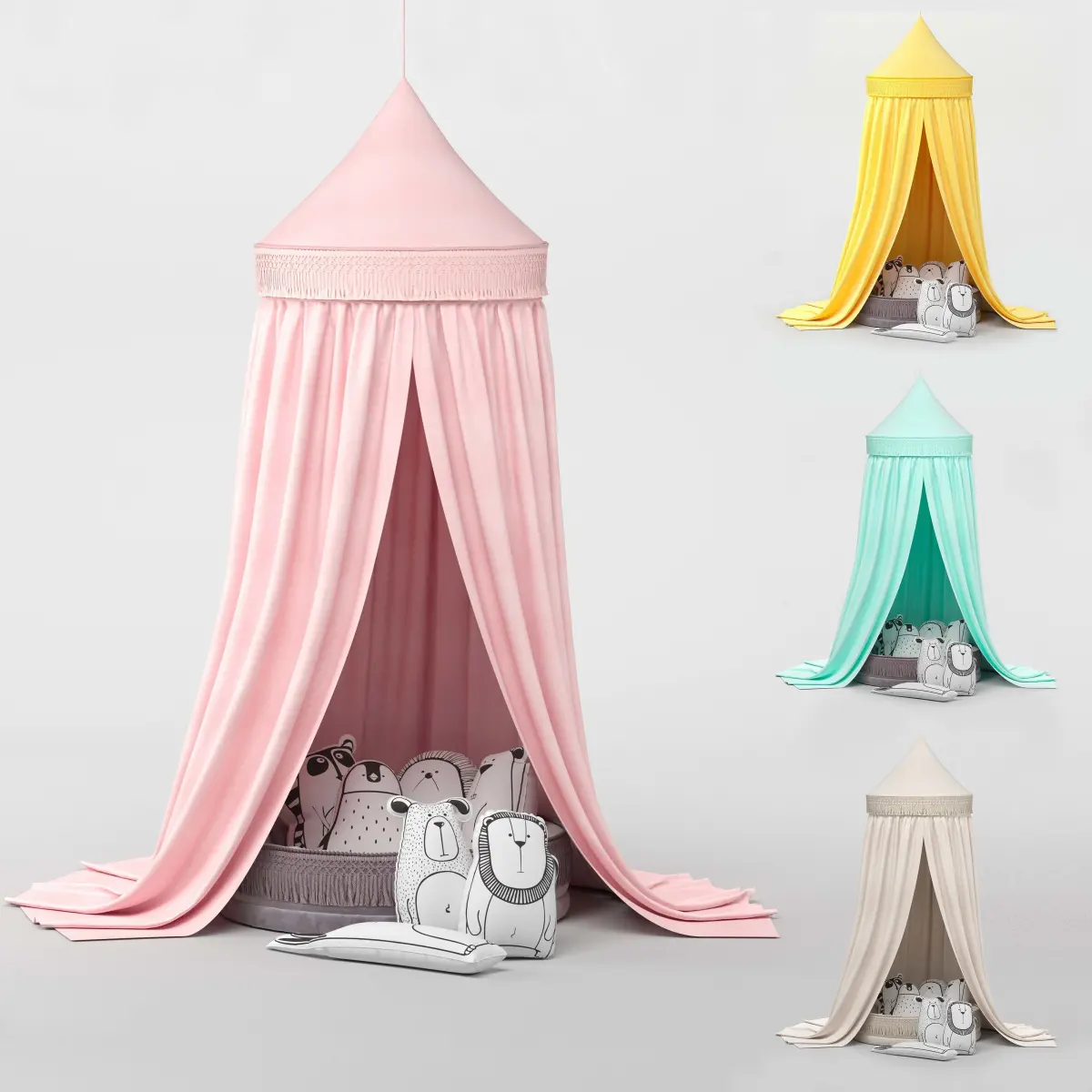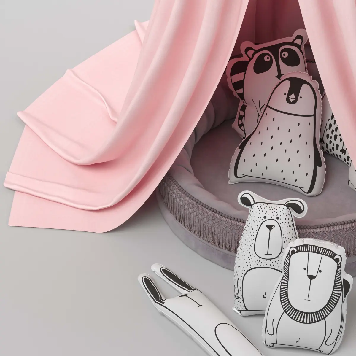The baby room set, including a soft and cozy area with a canopy, seven pillows with different animal designs, is stored at 3ds max 2016 in corona. In the archive of max, obj, mtl. This set is for the nursery or children & bedroom. This collection is available in four colors: pink, yellow, green and white. In this project, there are 557303 polygons and 556845 verts