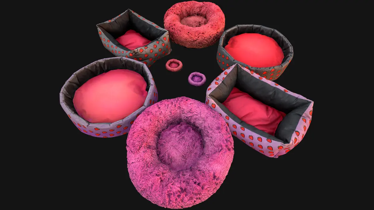 Game ready models .The models contains lods, detailed information on the images.Stylized and detailed Bed Pet Pack fully textured, sculpted and rendered with Physical based rendering (PBR) - Shown images have been rendered in Marmoset Toolbag .The models has two colors: The models has two colors: Purple and Red.The set contains 4 models of Pet Beds.