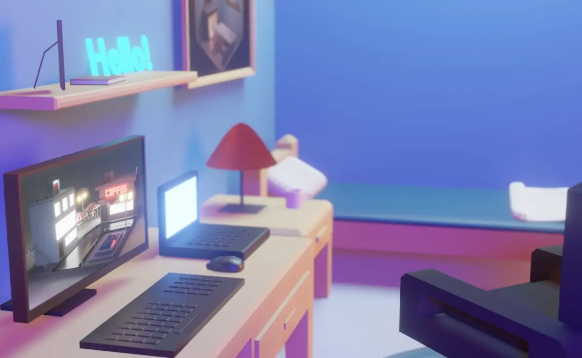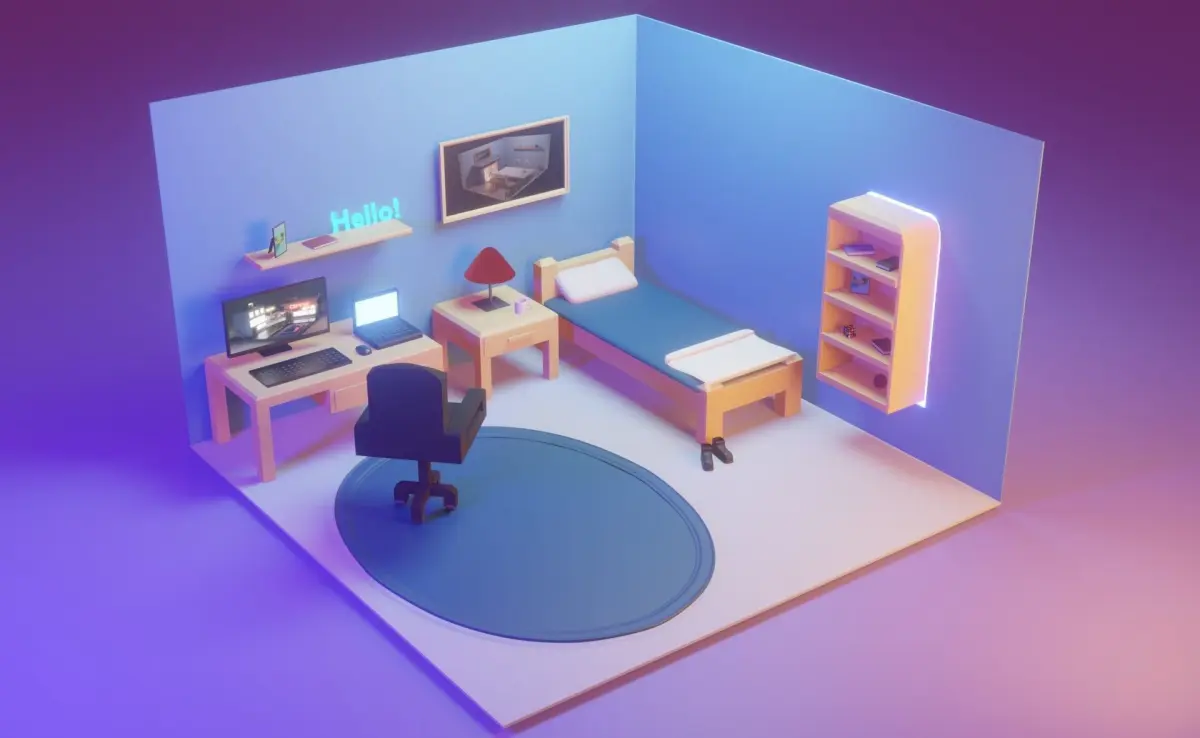 Single Bed Room with a PC Setup and a laptop. Moody and cozzy lighting that feels light on the eyes and some cute coloring to really capture that artistic and realistic feel. Hope u enjoy!