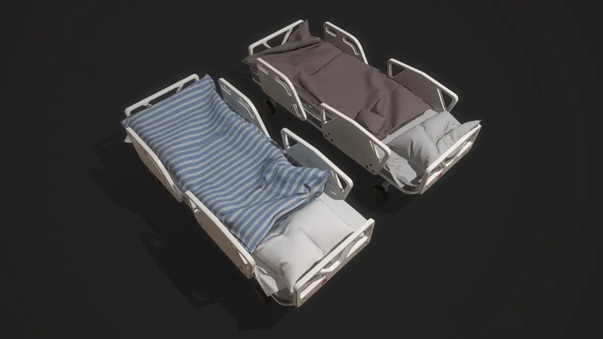 Low poly hospital bed, used PBR material, 3 unique bedding sets with realistic folds. Bed on wheelsgeometry optimized for use in game projects - Game ready high-quality assetsIdeal for use in unreal engineAll textures 4096*4096 Base colorNormal And ORM texture. In the RGB channels of this texture there is an information forR- Ambient OcclusionG-RoughnessB-Metallic