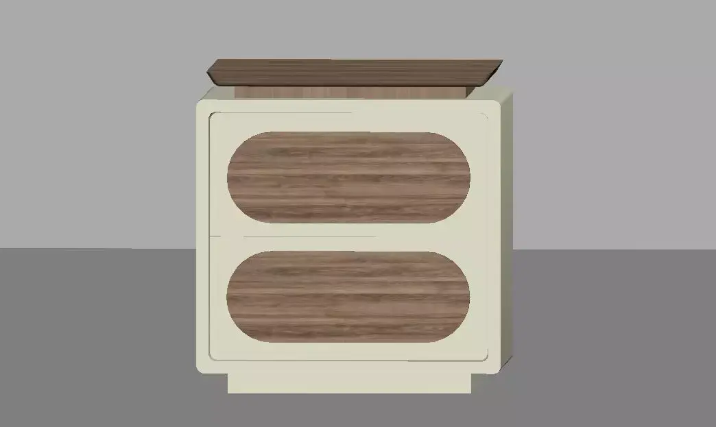 Modern side table / nightstand 3D model with a clean minimalist design.This model features a smooth rectangular body with rounded edges and two distinctive wooden drawer fronts set inside a light-colored frame. Each drawer has an elongated rounded design with a subtle groove detail that functions as an integrated handle, keeping the look seamless and contemporary. The top surface has a slightly overhanging wooden panel, making it perfect for use as a bedside table or accent storage unit in living rooms, bedrooms or offices.