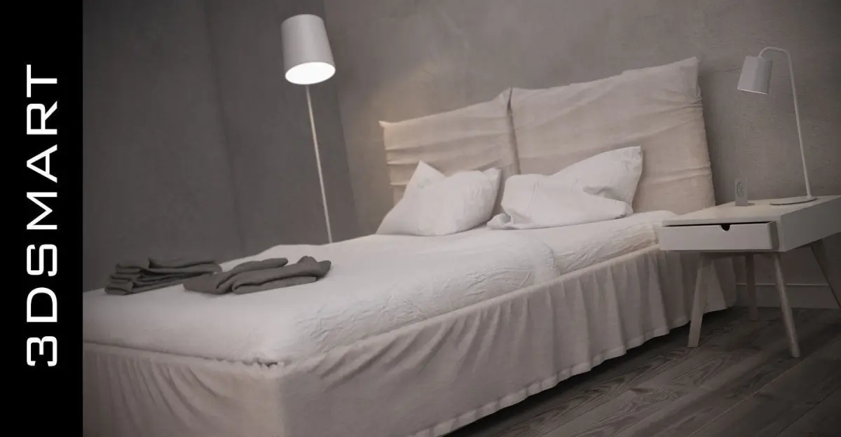 The model is fully shaded with all the materials seeable in the renderings. (NOTE: the file contains only the model of the bed with materials and textures - not the bedroom scene with concrete walls, wooden floor, floor lighting etc.)