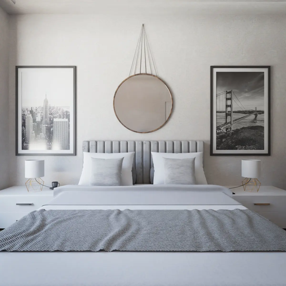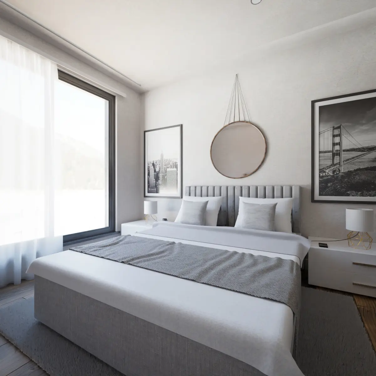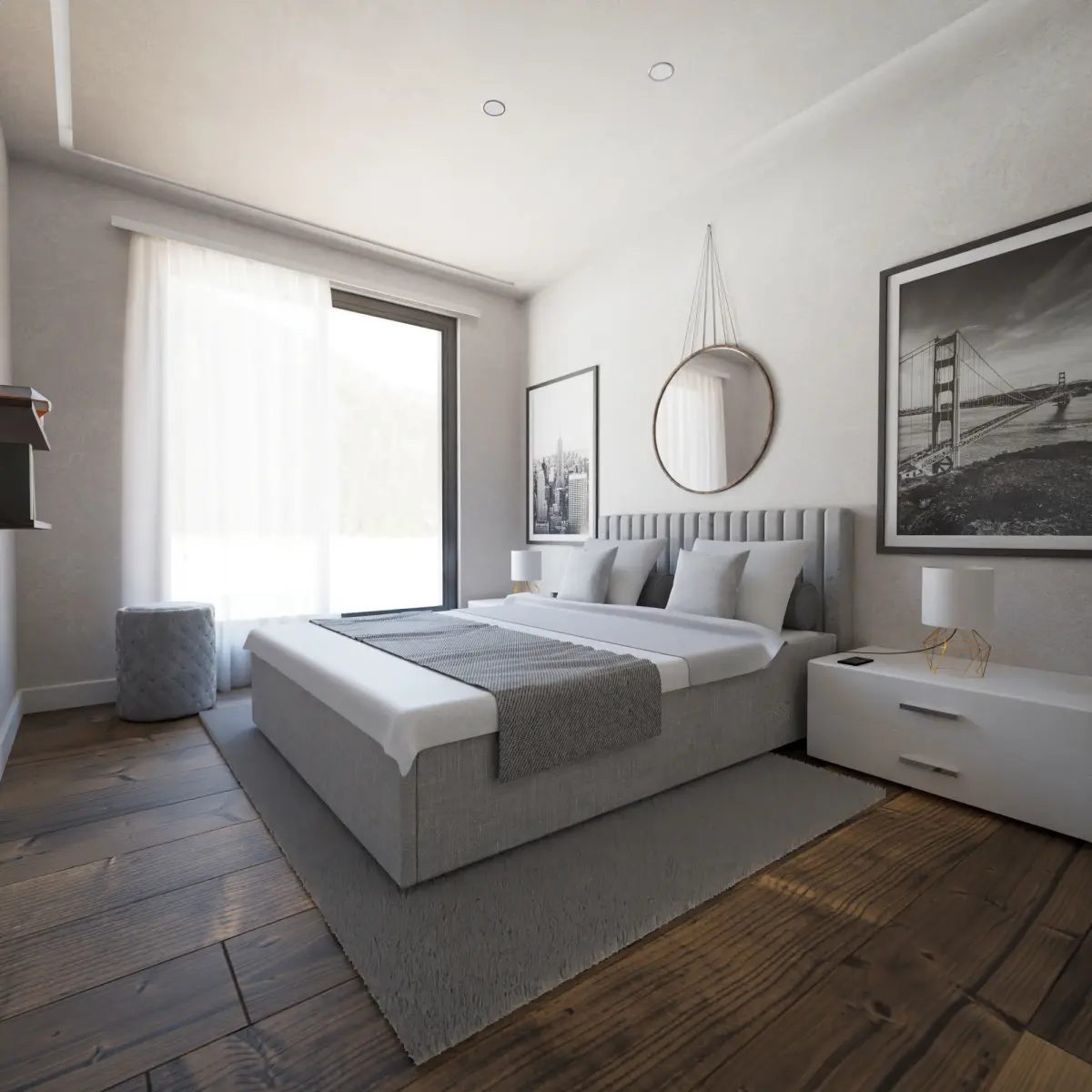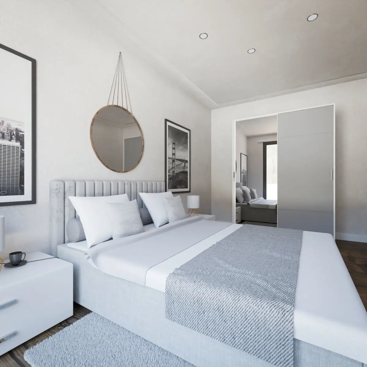 Hello, I present to you my next bedroom idea. White finish, furniture and the entire outline have been specially made and invented for a bright and lit interior, a large bed with two bedside tables with white accents, a wardrobe with a large sliding mirror and an additional mirror above the bed, a puff standing nearby and two shelves for books or other favorite things, everything was invented and then made in Blender. Thank you for your attention, I invite you to view this work and my others, and to purchase and enjoy all the privileges. Thank you and best regards!