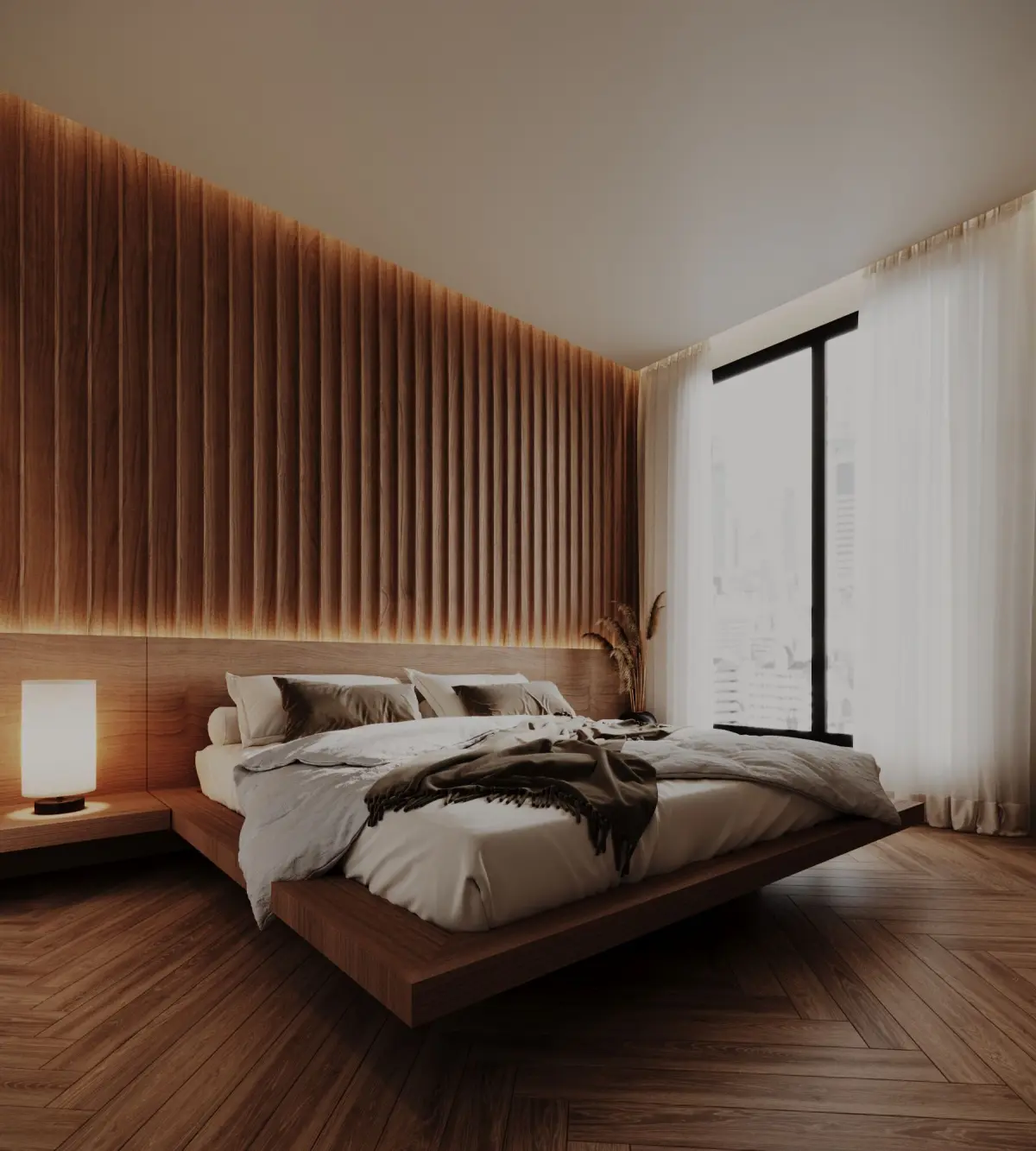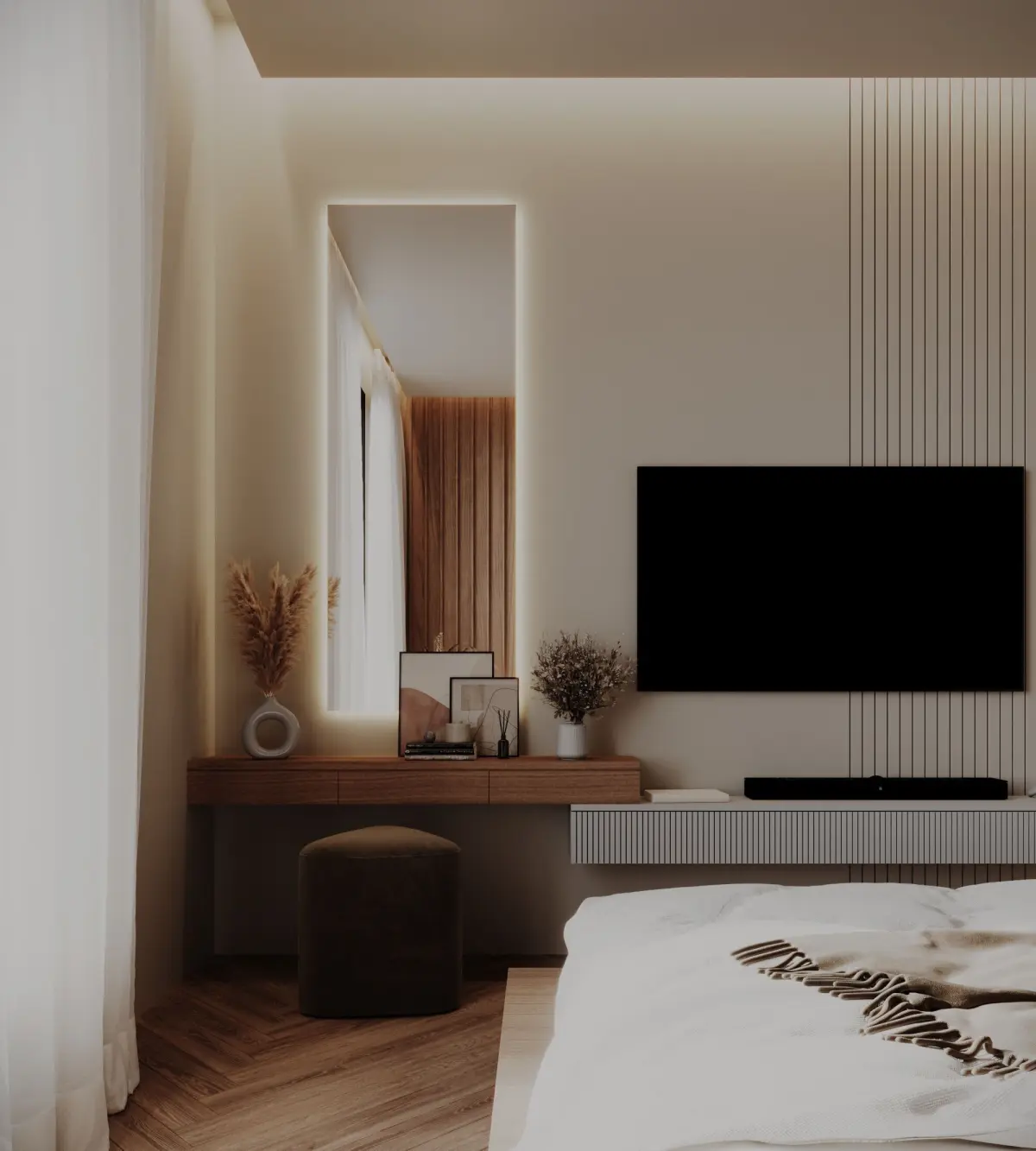 this 3d model is a modern bedroom with a modern and realistic design, created using 3ds max and corona render. the scene includes PBR materials, professional lighting, and optimized render settings,delivering photorealistic results.