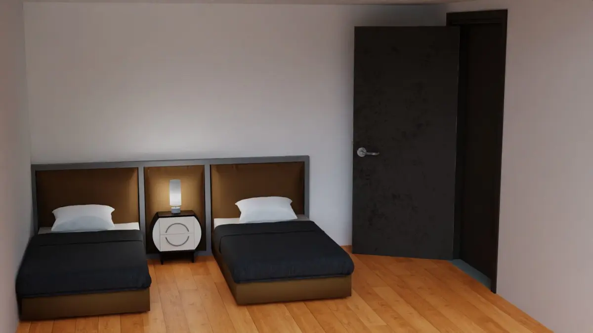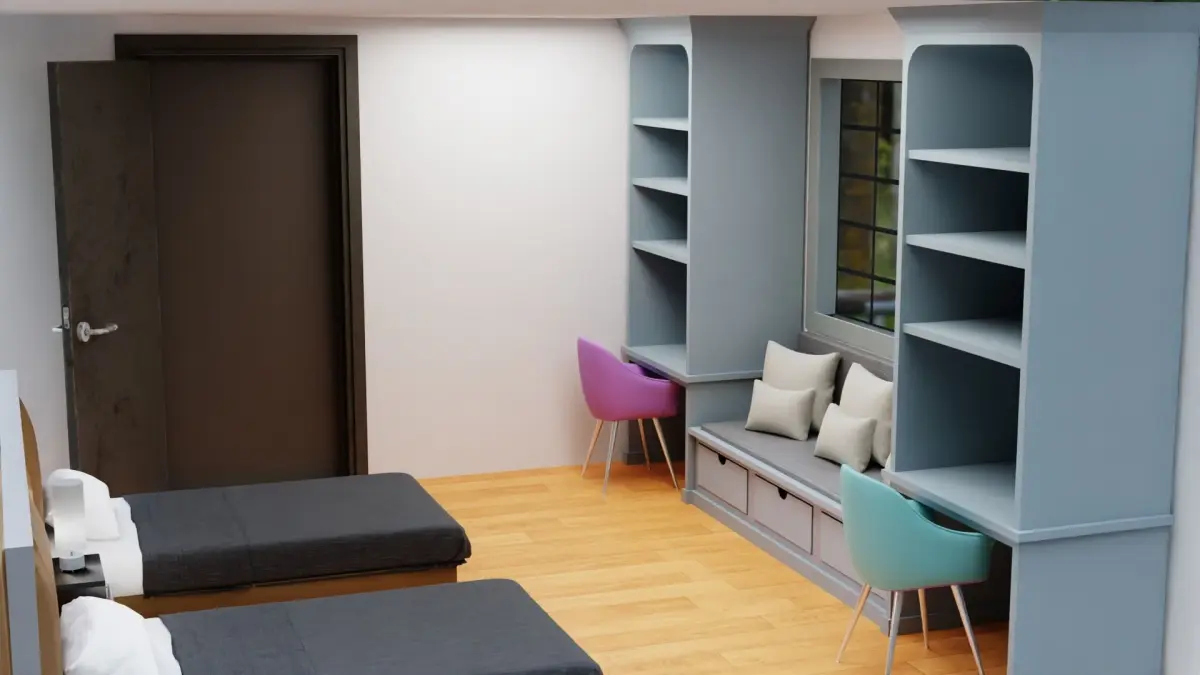 A beutifull bedroom for two kids with office can add it to your model .