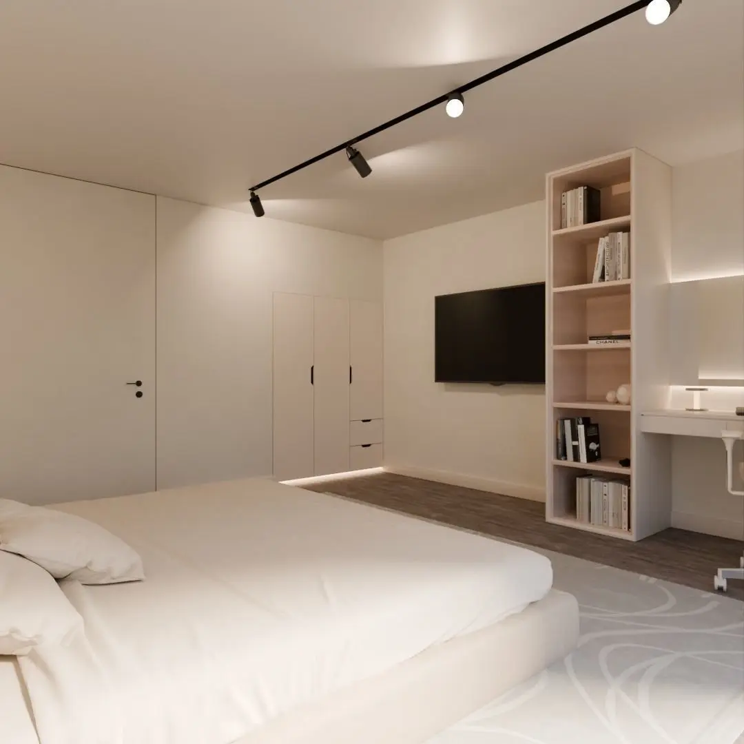 3d model of the bedroom.A modern and light style, often associated with minimalism, emphasizes simplicity, clean lines, and a sense of openness. This design approach often features neutral color palettes, such as whites, grays, and natural tones, which create a sense of spaciousness and tranquility. Furniture and decor are often sleek and uncluttered, with an emphasis on functionality and practicality.