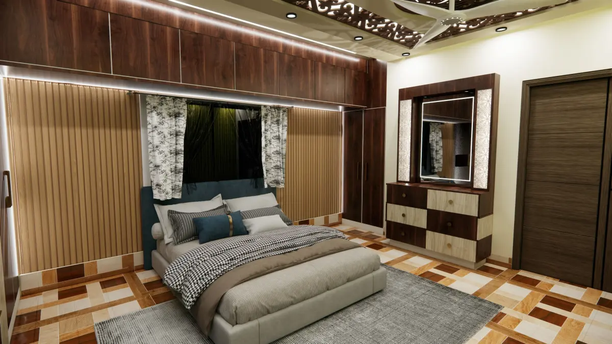 Textures and Materials:A variety of textures enhance the tactile experience of the space. The area rug beneath the bed is a plush, handwoven wool rug that adds warmth and softness underfoot. Velvet cushions and silk throws bring a sense of lavishness, while the dark wood flooring contrasts beautifully with the lighter tones in the room.