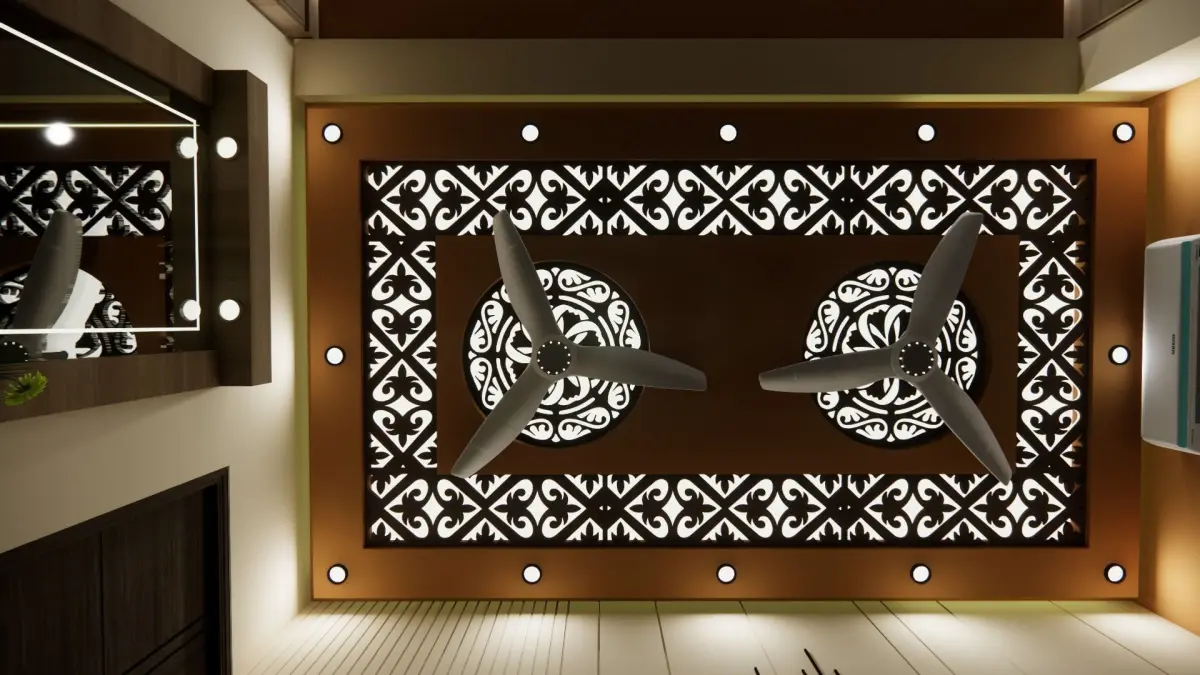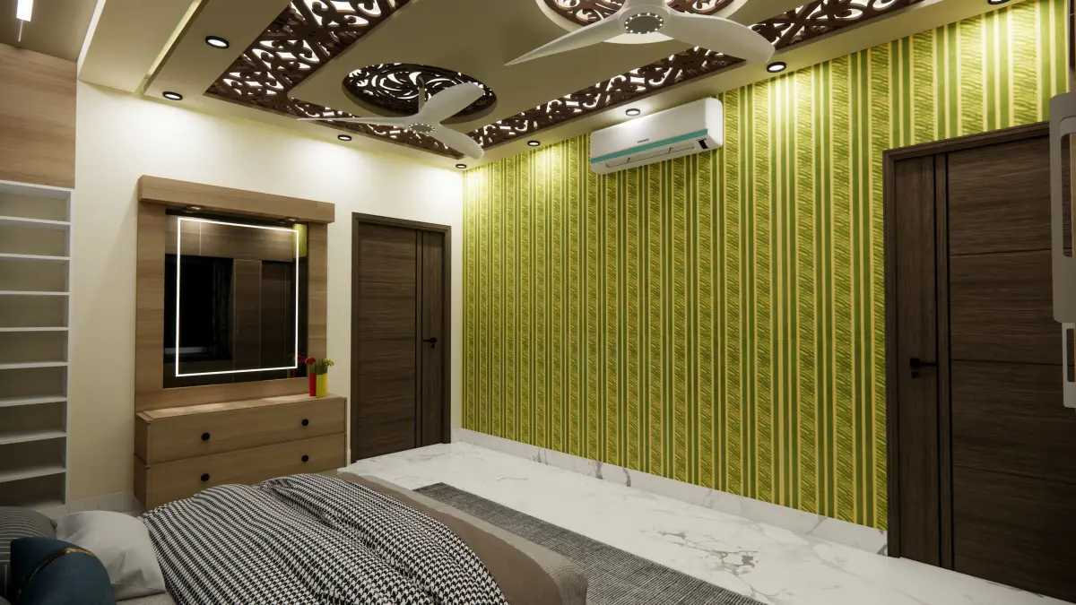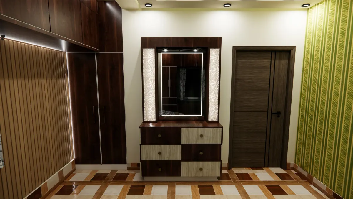 Dressing Area:Adjacent to the seating nook is a well-appointed dressing area. A sleek vanity with a tri-fold mirror provides ample space for getting ready, featuring drawers lined in velvet for storing jewelry and cosmetics. Soft, diffused lighting surrounds the mirror, ensuring a well-lit and flattering space for grooming.
