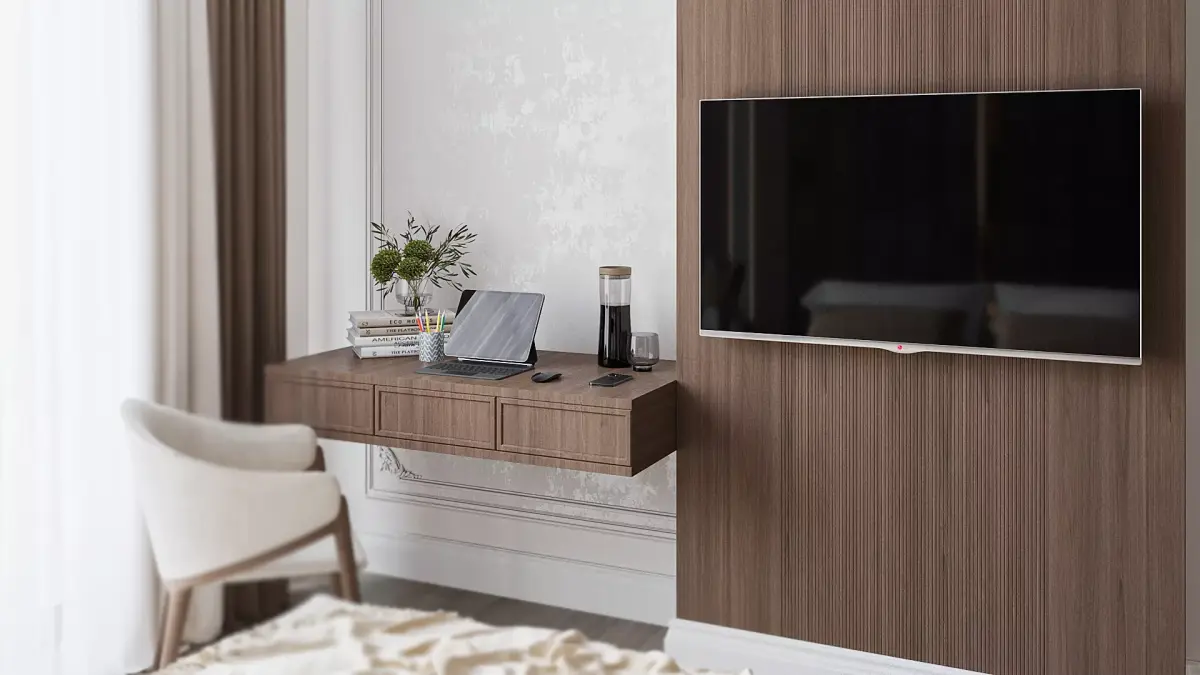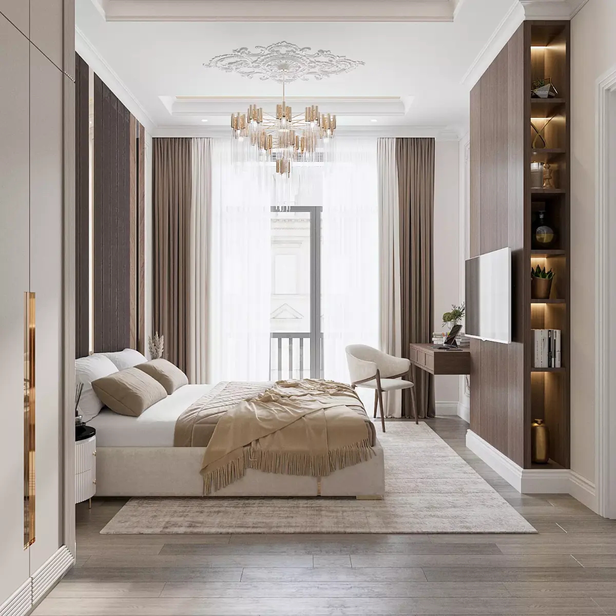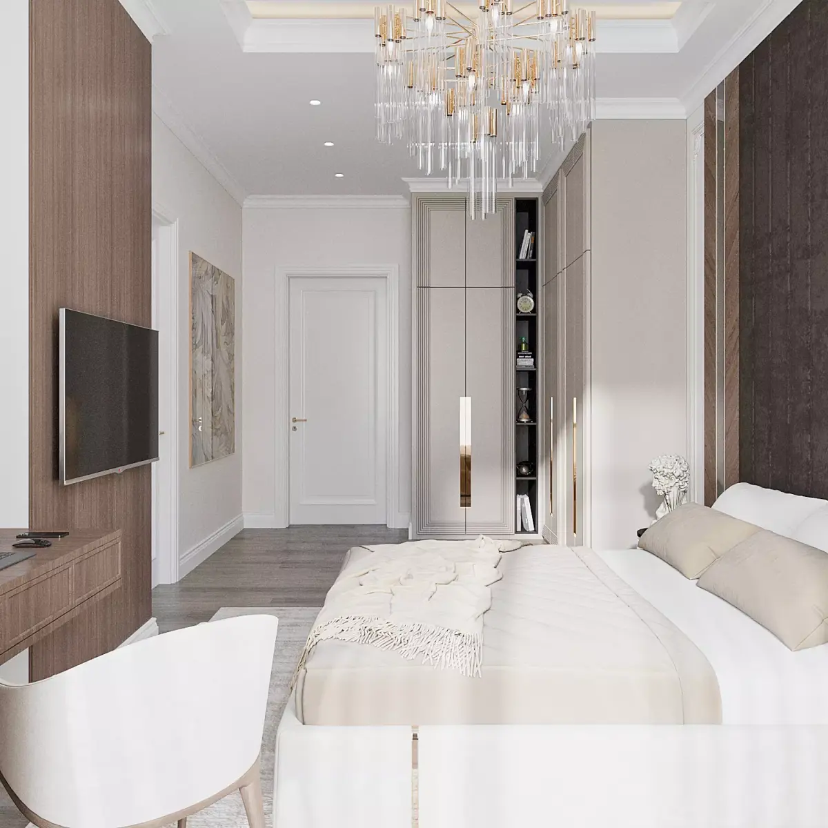 The bedroom is conceived as a peaceful retreat with a balanced layout and a warm, inviting atmosphere. Furniture placement ensures clear circulation and maximum comfort.