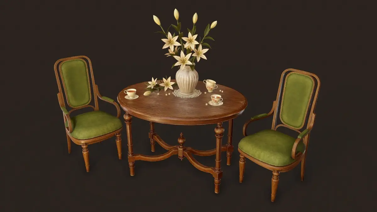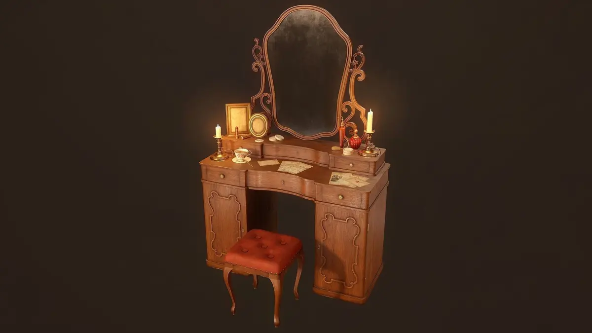 Victorian Bedroom Furniture Props Pack includes: Bed, Double bed, Pouf, Bedside table, Wardrobe, Vanity table, Room divider, Floor mirror, Commode, Dining table and chair, Oil lamps, Candles, Vase with lilies, Picture frames, Perfume bottles and other Bedroom props.