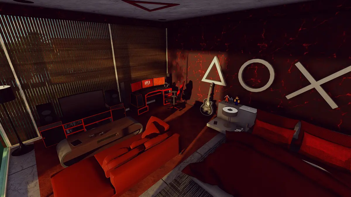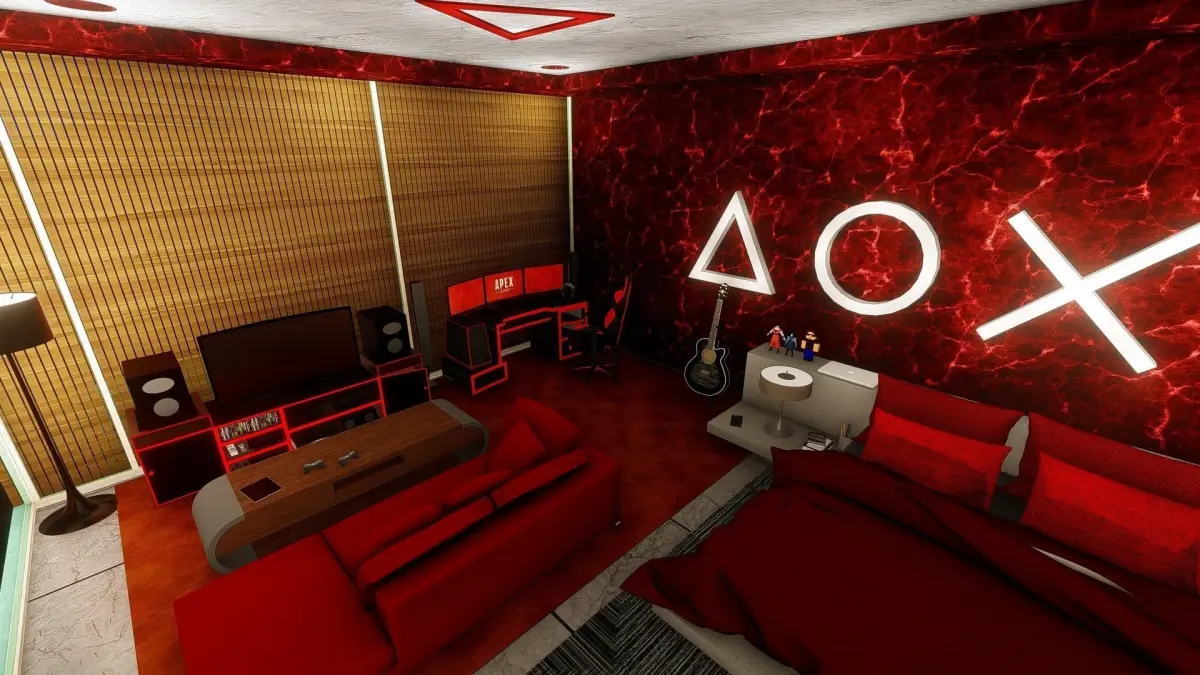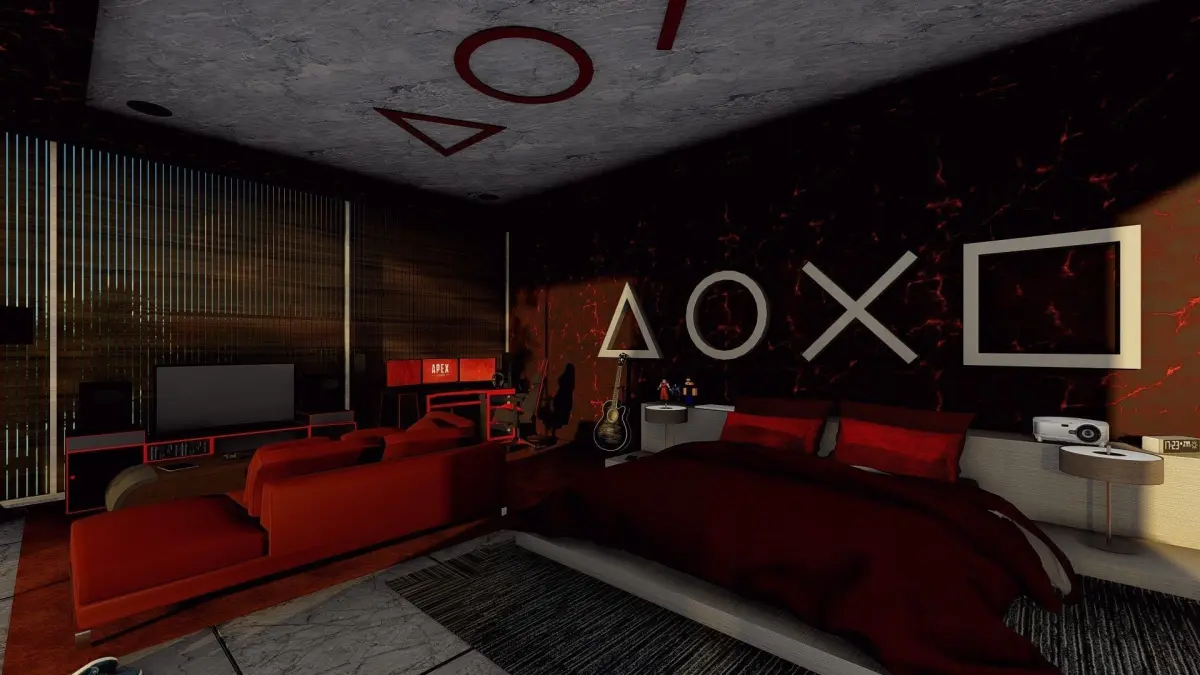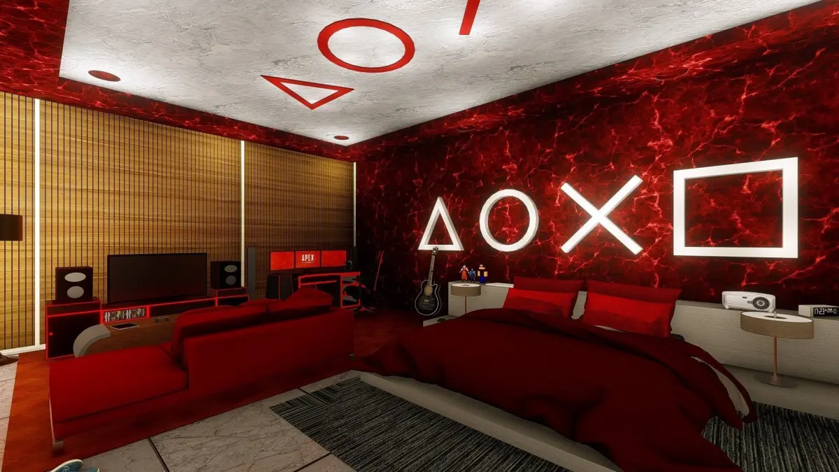 Gaming Room SetupPlaystation wall 3d logoRed color domination designModern Bedroom setup