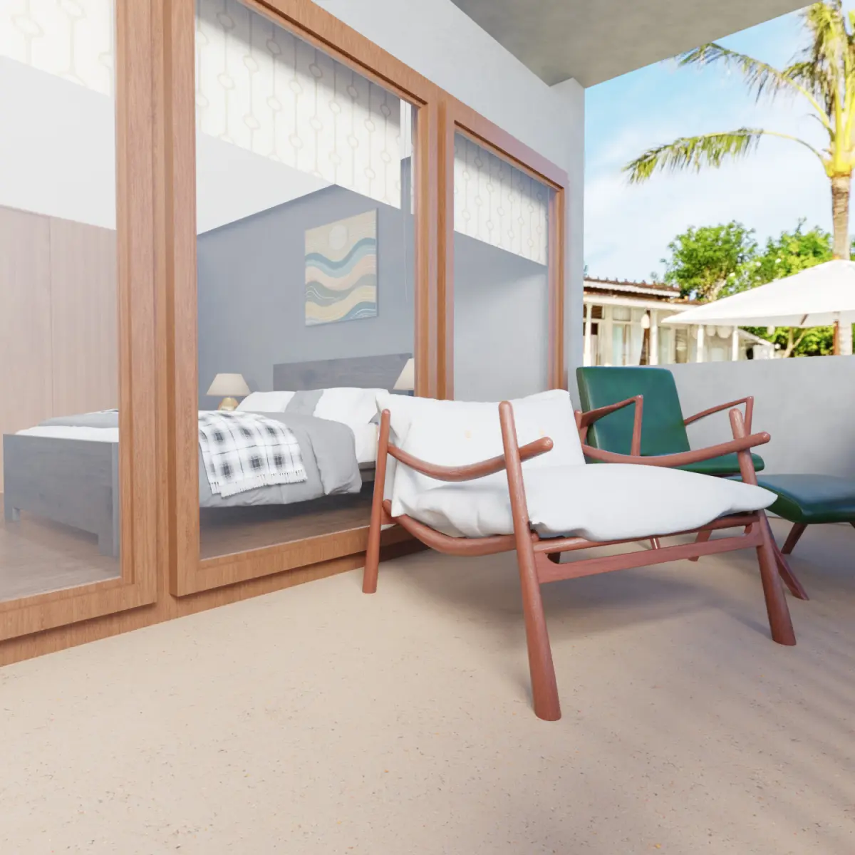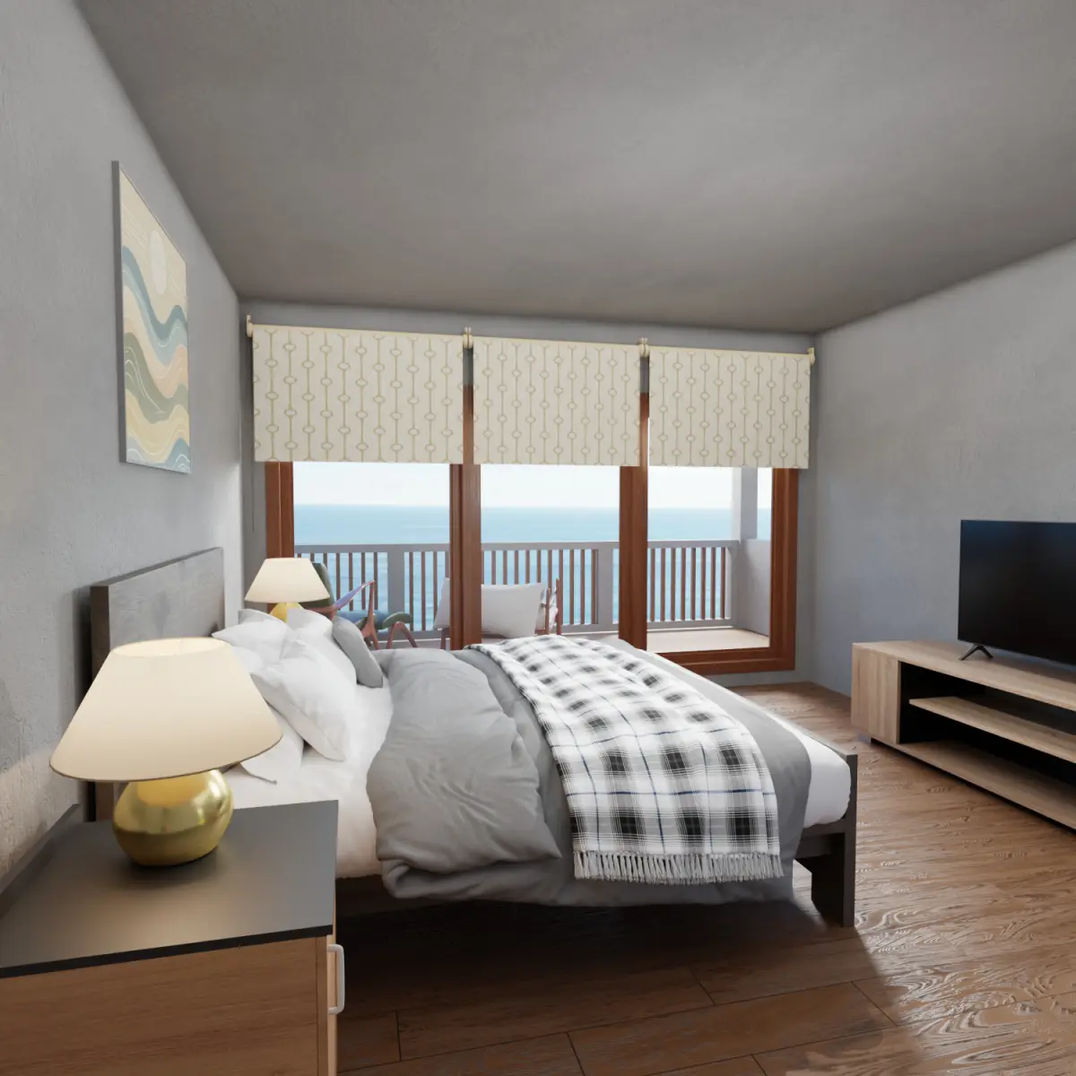 Floor-to-ceiling glass doors open up to a stunning ocean view, framed by stylish patterned blinds that filter in natural light. The hardwood flooring adds depth and richness, balancing the contemporary and organic elements. Outside, a private balcony with chic lounge chairs invites relaxation, making this bedroom a perfect retreat by the sea.