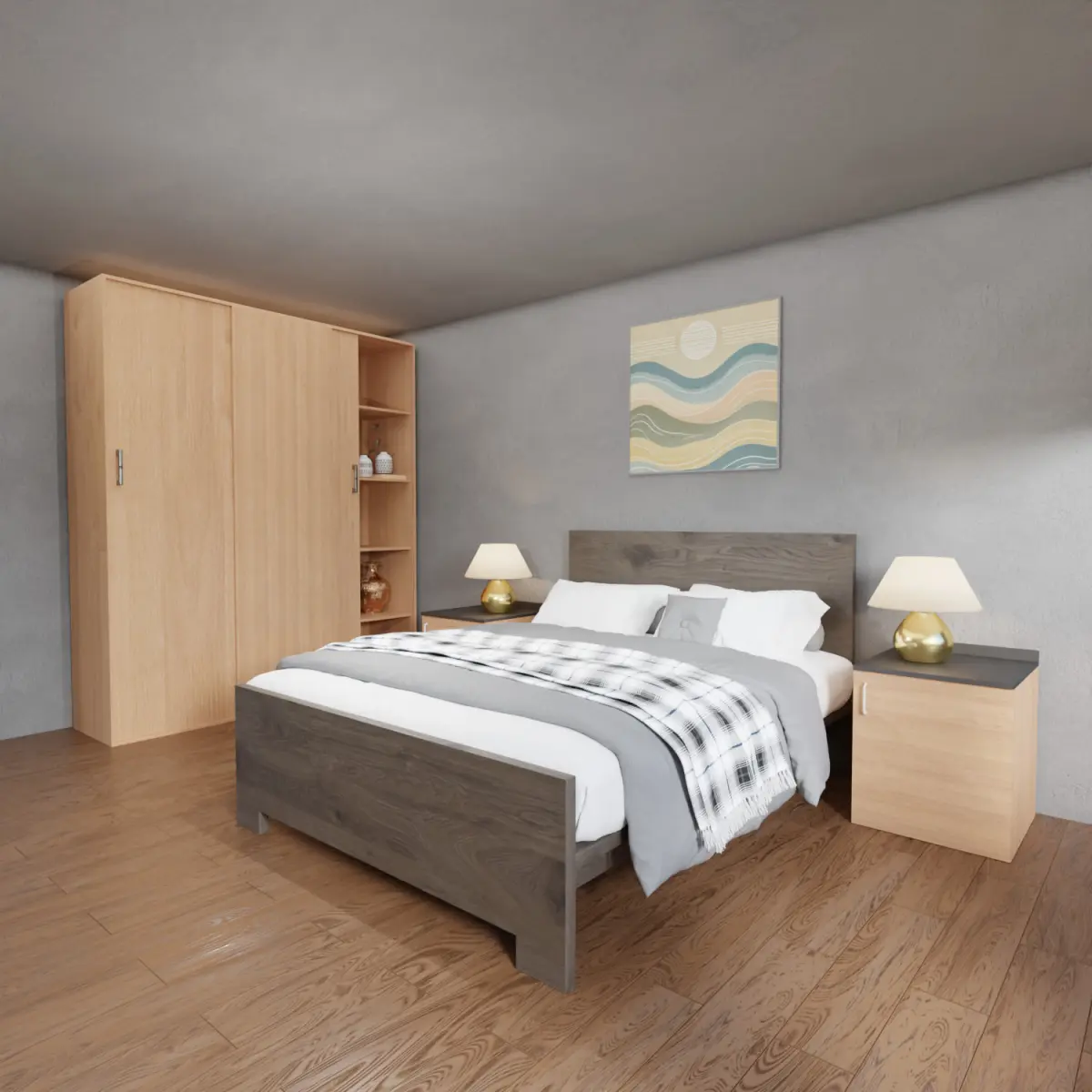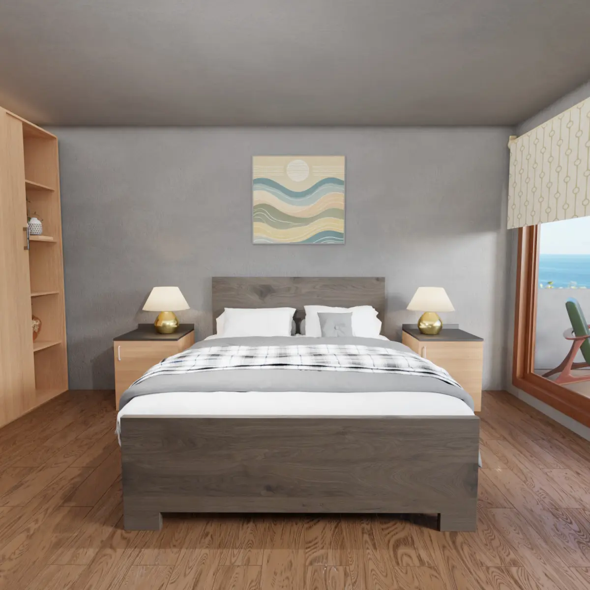 This elegant coastal bedroom seamlessly blends modern minimalism with natural warmth. The centerpiece is a sleek wooden bed frame, complemented by crisp white linens, a soft gray throw, and a classic plaid blanket for a cozy touch. Flanking the bed are matching nightstands with gold-accented lamps, adding a subtle hint of luxury. The textured gray walls create a soothing ambiance, while the abstract wave painting above the bed enhances the room’s tranquil aesthetic.
