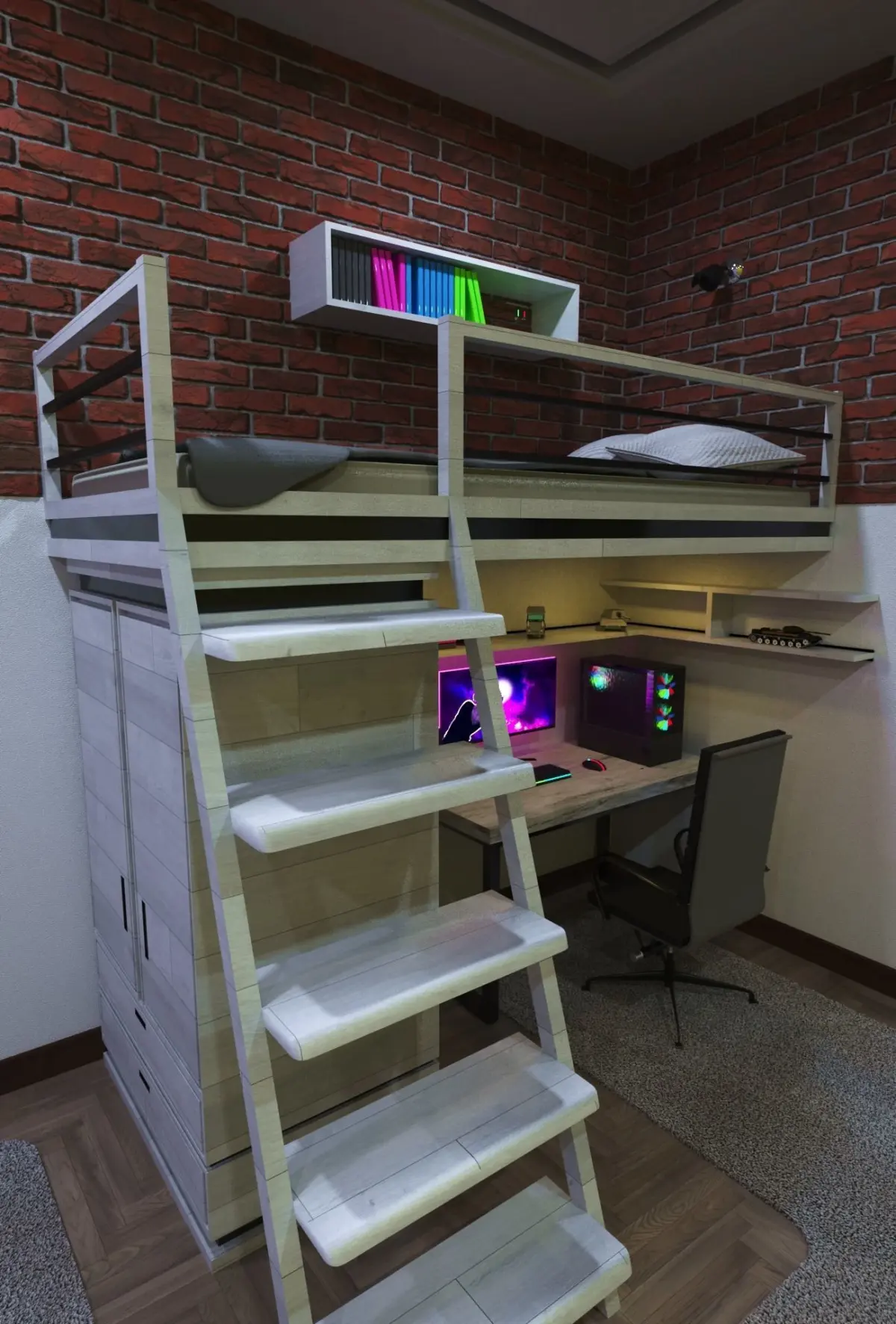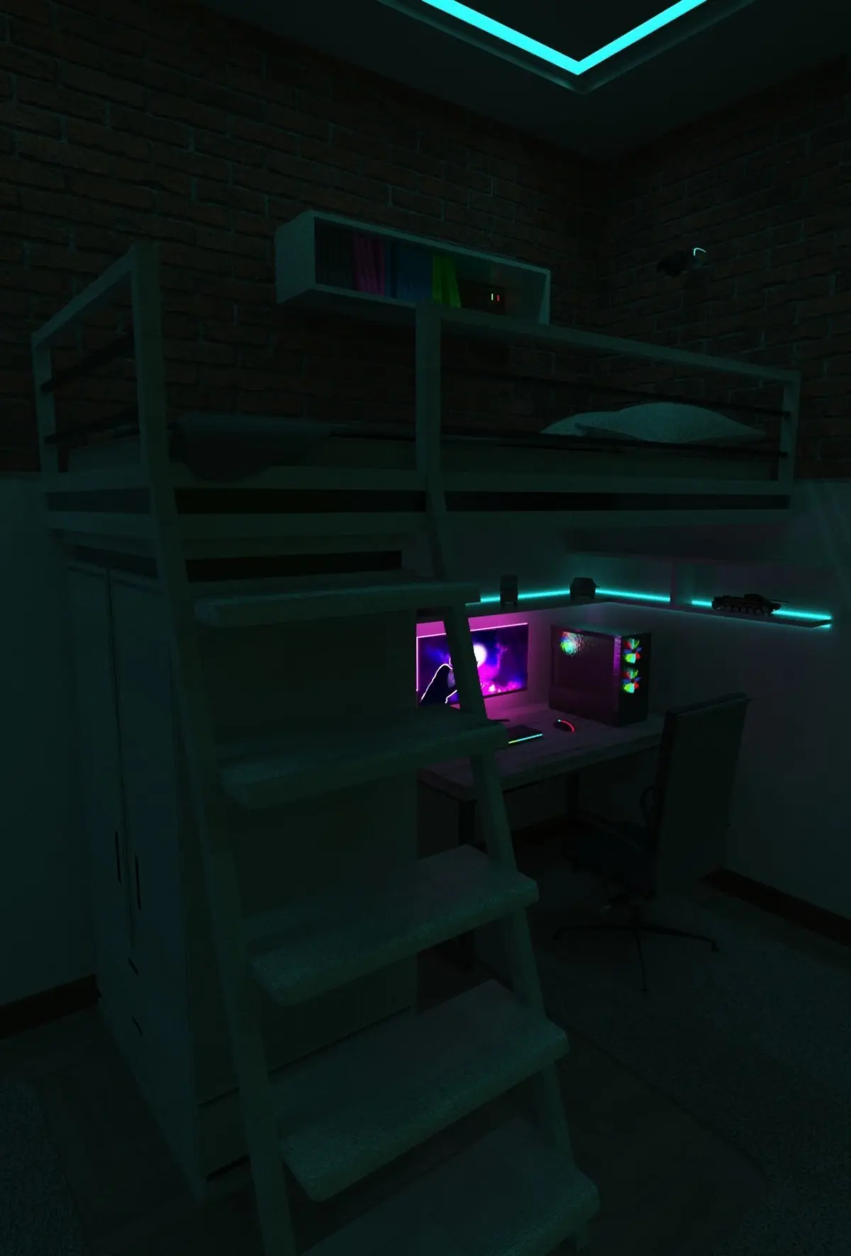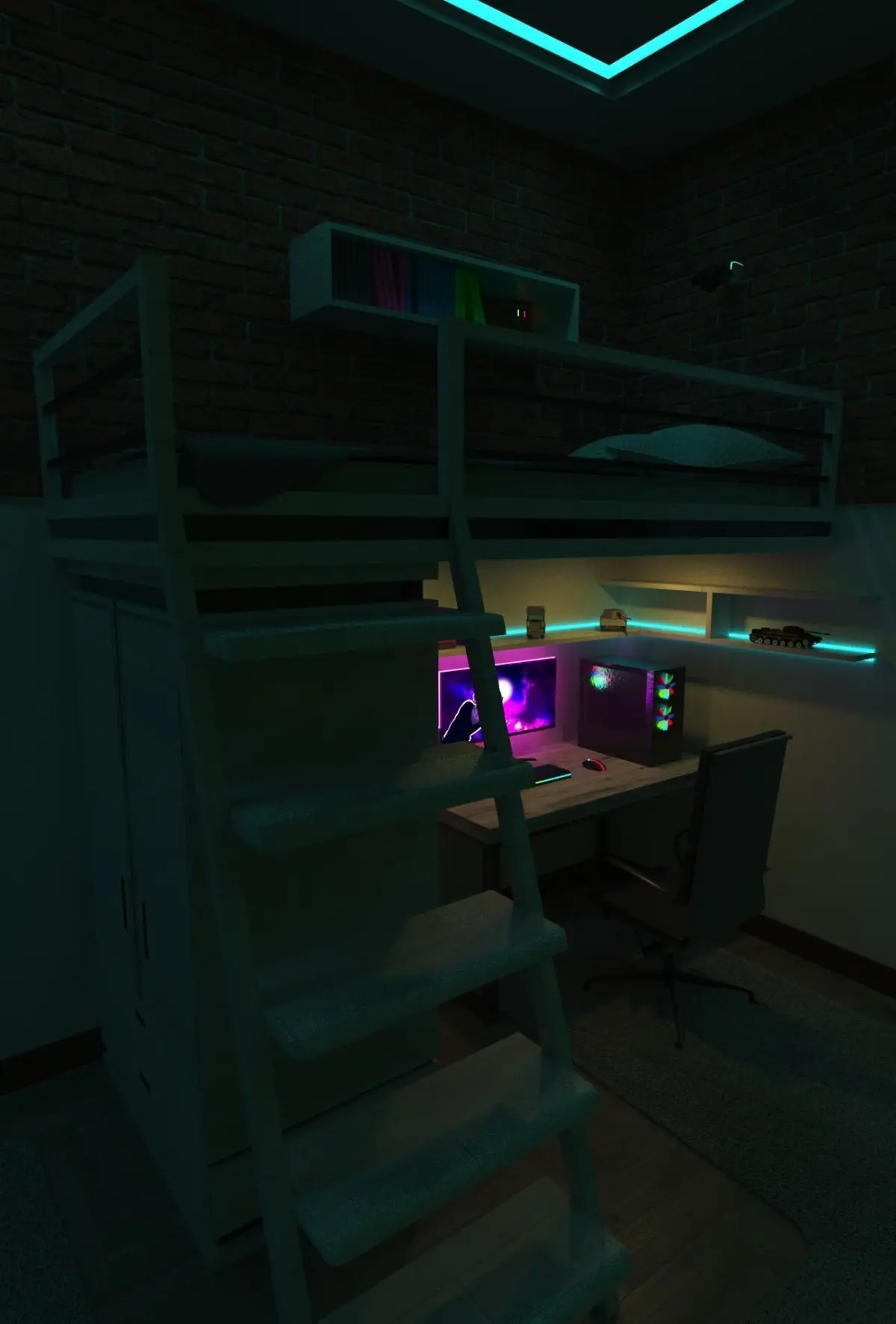 There are models of a bed, pillow, mattress, PC, a table for a PC, an armchair, a cabinet, a keyboard, a mouse, a monitor.