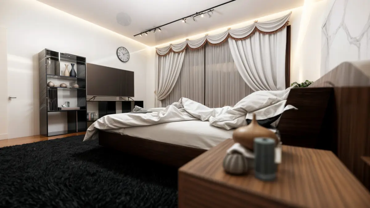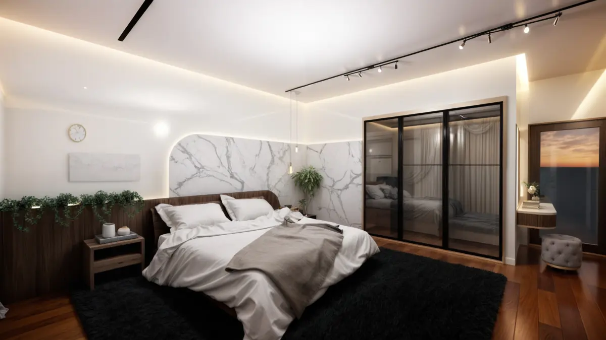 Bedroom design.Dimensions 4 by 5.In a minimalist and modern style.The material of the slab behind the bed is white marble.The frame around the wardrobe is made of aluminum metal.A counter and mirror for makeup, a closet with enough space for items, a large bed, curtains, TV, TV table, and other accessory items.