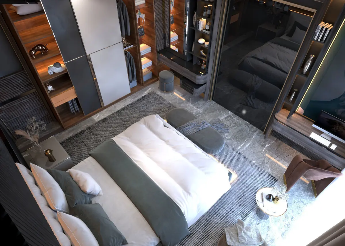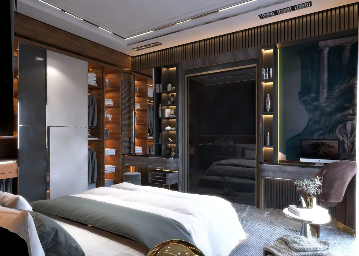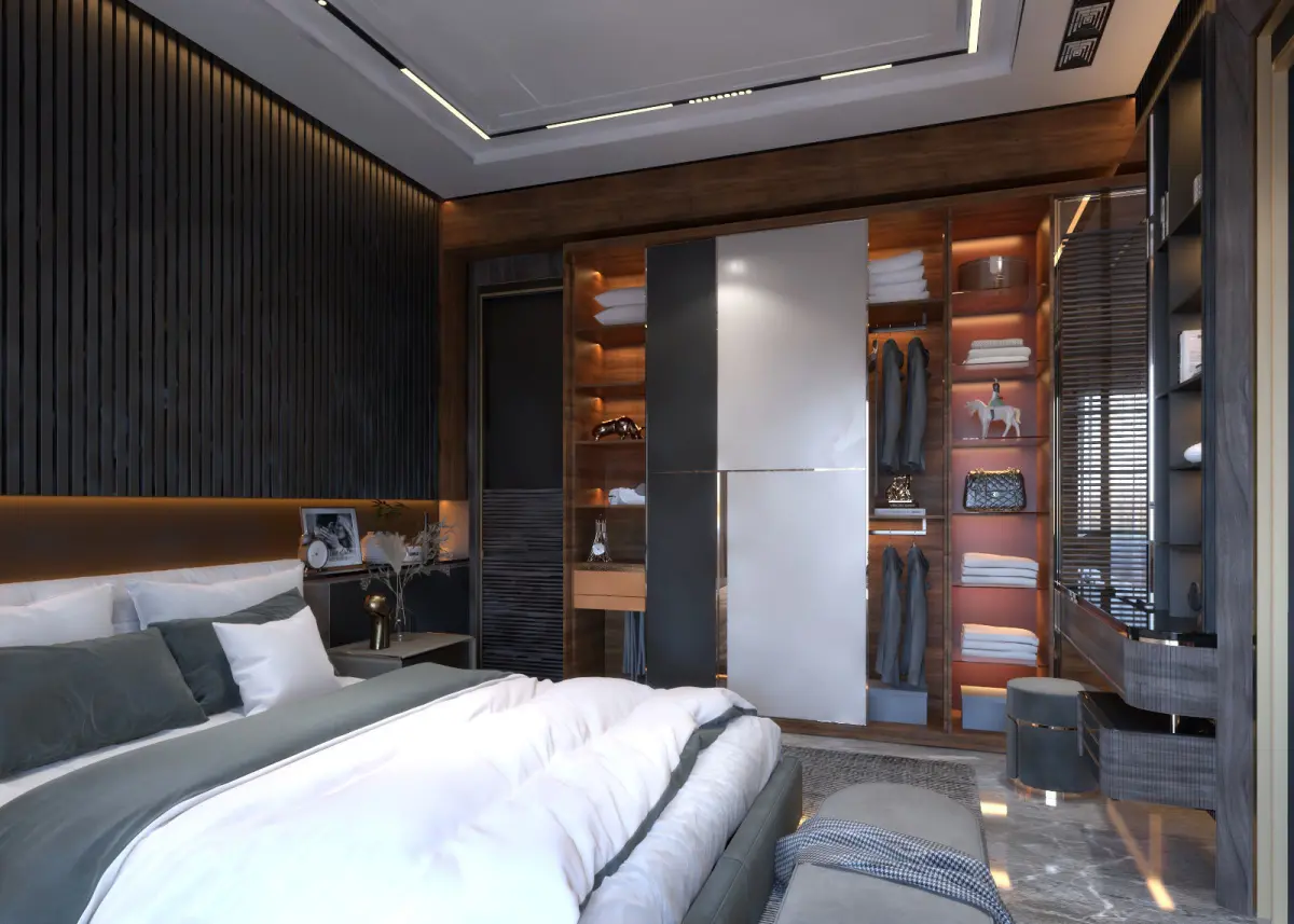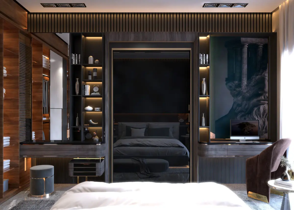 this bedroom designed by oak stripes wood with lights ( 3dsmax 2019 & vray rendering 5 ) you can use the light and materials setting inside the file polys 6531.210verts 5184.466