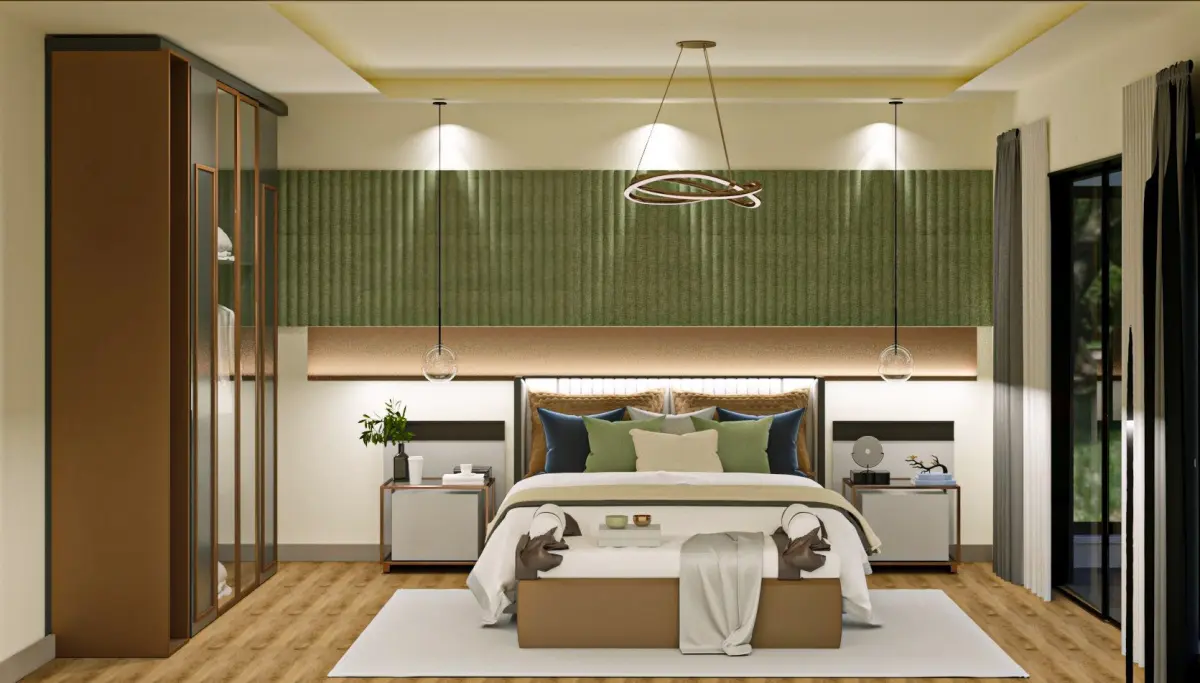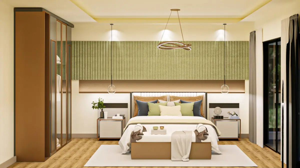Bedroom design modeling. It had a sliding door leading to the balcony. The effect of relaxation was given to the space with green tones.