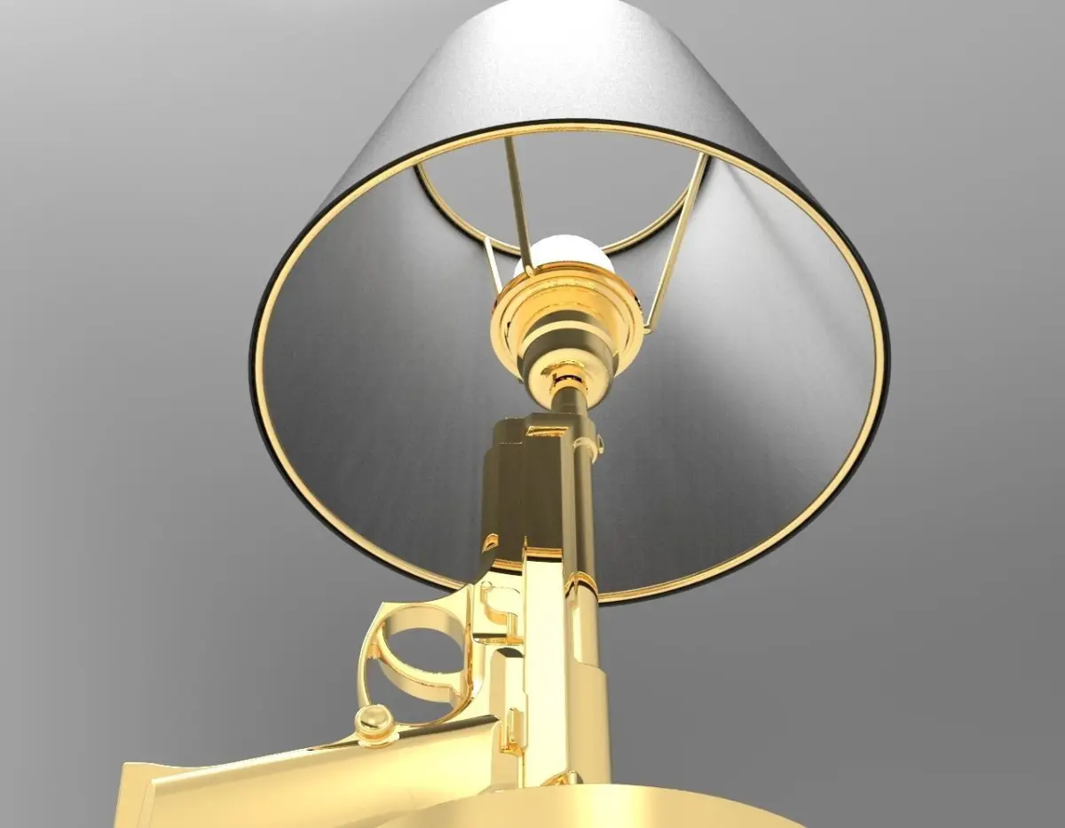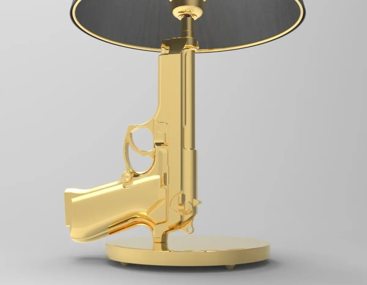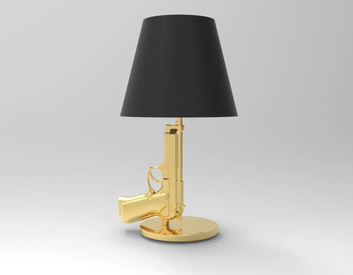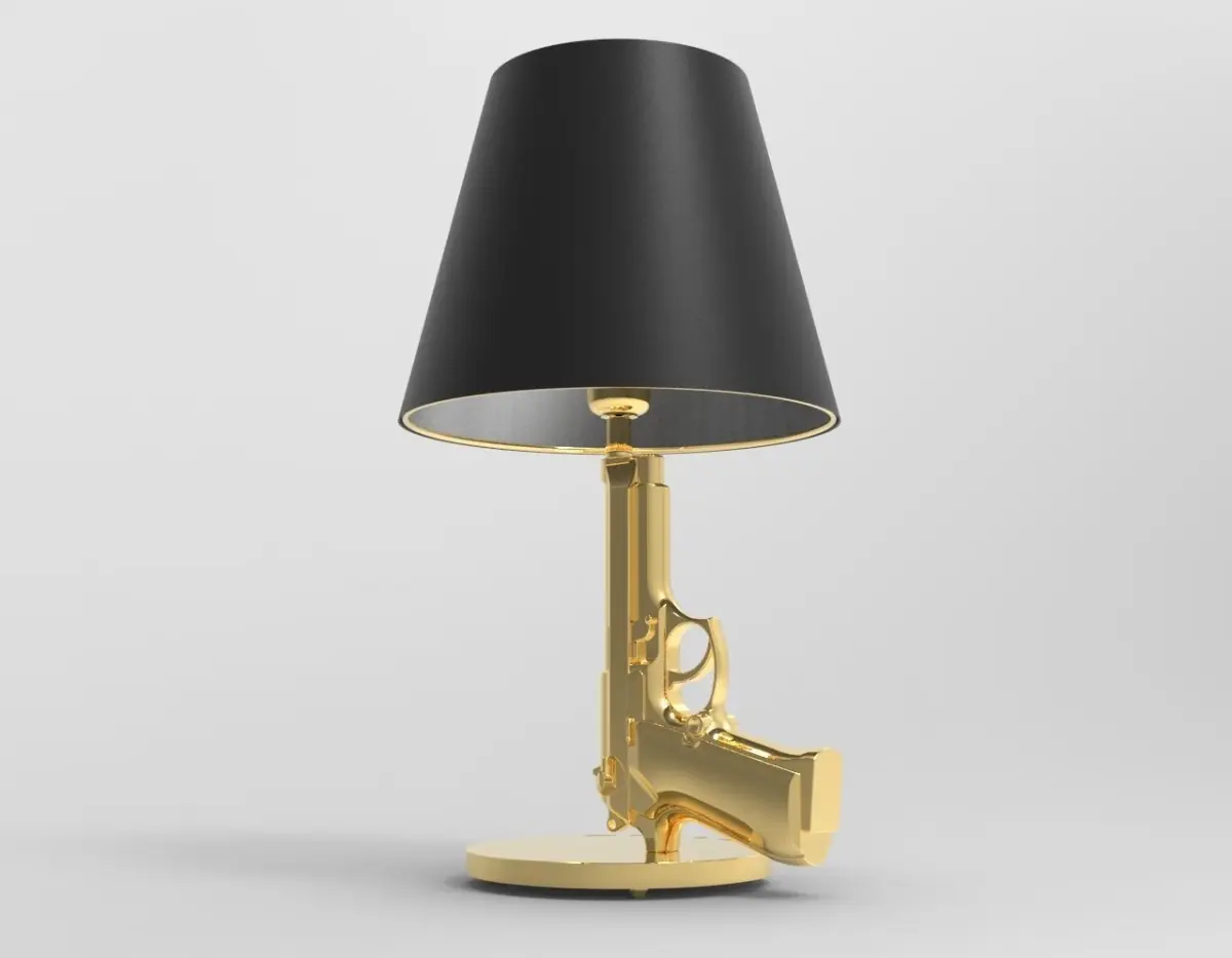 The Guns-Bedside Gun table lamp combines beauty with style. The Guns-Beside Gun table lamp is suitable for any type of furniture, be it vintage, retro or classic. Its incredible charm is given by its measurements, i.e. H 42.6 cm / Diam. Ø 16 cm - Lampshade Diam. Ø 23.6 cm.The stem and the base are in die-cast aluminum, resistant material, covered with a polymer with a 18K gold foil, to make the color of the lamp more shiny and realistic, the lampshade is instead in matte black palastificato paper, which is well accords with the gold of the stem and that inside it carries an 18K gold serigraphy. The rest of the inserts are plastic, to make this work of art even more resistant.