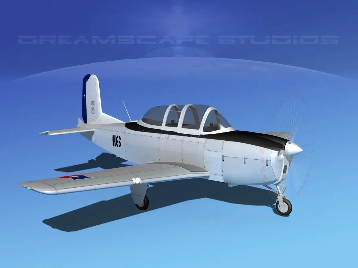 Beechcraft T-34 Mentor Chile This model was originally built in Max 7 in 2006. It is near to scale (within 3-4% of scale) and fully textured. It has been updated using Max 11 in 2017 with high quality smoother mesh, more detail, better cockpits, better textures and higher quality diffuse mapping. 95 percent of all the mesh has been replaced or heavily modified. It comes with all the materials and textures shown in renderings here. It is available in several formats for a wide variety of end users. This model comes with many different liveries. It is built to be used in in-flight or airport ground animations and video or simulation. It can also be used to populate an airport scene. The model has animated propeller. It also has animateable ailerons, flaps, rudder, and elevators. The cockpit is semi detailed including control yokes grips engine controls rudder pedals seating and instrument panel. This model also has animated control surfaces including ailerons, elevators, rudder and flaps. These are animated through their nominal range of motion. In addition the propeller is animated at idle speed.
