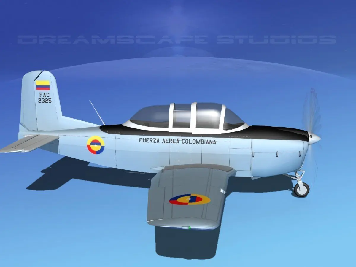 Beechcraft T-34 Mentor Colombia This model was originally built in Max 7 in 2006. It is near to scale (within 3-4% of scale) and fully textured. It has been updated using Max 11 in 2017 with high quality smoother mesh, more detail, better cockpits, better textures and higher quality diffuse mapping. 95 percent of all the mesh has been replaced or heavily modified. It comes with all the materials and textures shown in renderings here. It is available in several formats for a wide variety of end users. This model comes with many different liveries. It is built to be used in in-flight or airport ground animations and video or simulation. It can also be used to populate an airport scene. The model has animated propeller. It also has animateable ailerons, flaps, rudder, and elevators. The cockpit is semi detailed including control yokes grips engine controls rudder pedals seating and instrument panel. This model also has animated control surfaces including ailerons, elevators, rudder and flaps. These are animated through their nominal range of motion. In addition the propeller is animated at idle speed.
