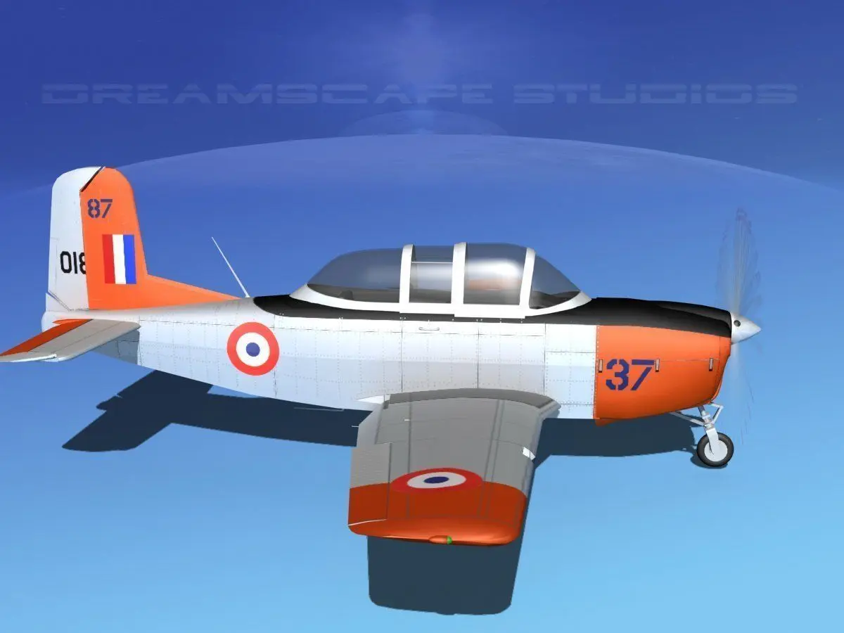 Beechcraft T-34 Mentor France This model was originally built in Max 7 in 2006. It is near to scale (within 3-4% of scale) and fully textured. It has been updated using Max 11 in 2017 with high quality smoother mesh, more detail, better cockpits, better textures and higher quality diffuse mapping. 95 percent of all the mesh has been replaced or heavily modified. It comes with all the materials and textures shown in renderings here. It is available in several formats for a wide variety of end users. This model comes with many different liveries. It is built to be used in in-flight or airport ground animations and video or simulation. It can also be used to populate an airport scene. The model has animated propeller. It also has animateable ailerons, flaps, rudder, and elevators. The cockpit is semi detailed including control yokes grips engine controls rudder pedals seating and instrument panel. This model also has animated control surfaces including ailerons, elevators, rudder and flaps. These are animated through their nominal range of motion. In addition the propeller is animated at idle speed.