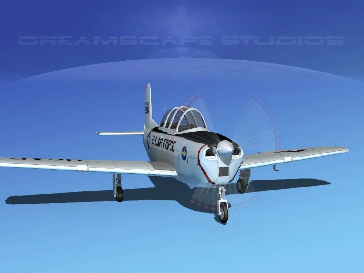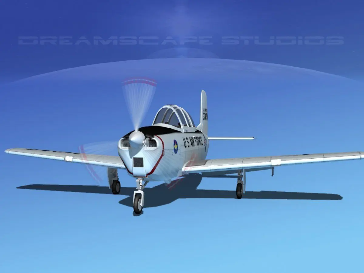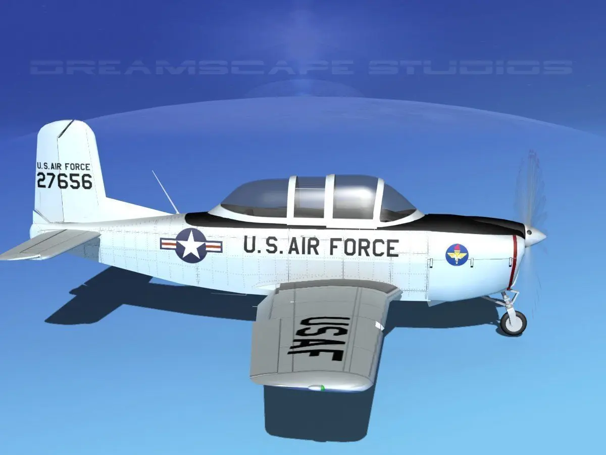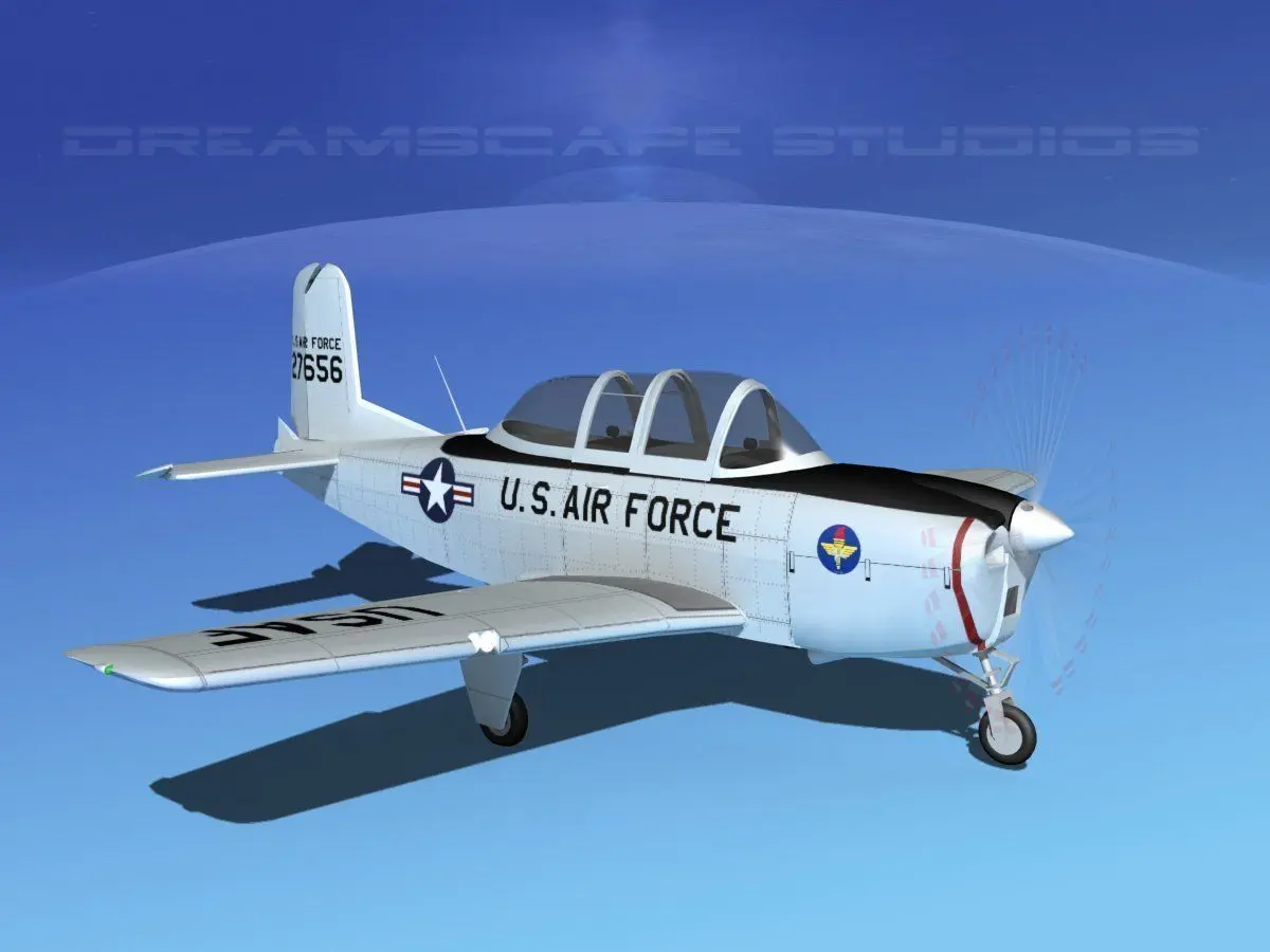 Beechcraft T-34 Mentor V11 USAF This model was originally built in Max 7 in 2006. It is near to scale (within 3-4% of scale) and fully textured. It has been updated using Max 11 in 2017 with high quality smoother mesh, more detail, better cockpits, better textures and higher quality diffuse mapping. 95 percent of all the mesh has been replaced or heavily modified. It comes with all the materials and textures shown in renderings here. It is available in several formats for a wide variety of end users. This model comes with many different liveries. It is built to be used in in-flight or airport ground animations and video or simulation. It can also be used to populate an airport scene. The model has animated propeller. It also has animateable ailerons, flaps, rudder, and elevators. The cockpit is semi detailed including control yokes grips engine controls rudder pedals seating and instrument panel. This model also has animated control surfaces including ailerons, elevators, rudder and flaps. These are animated through their nominal range of motion. In addition the propeller is animated at idle speed.