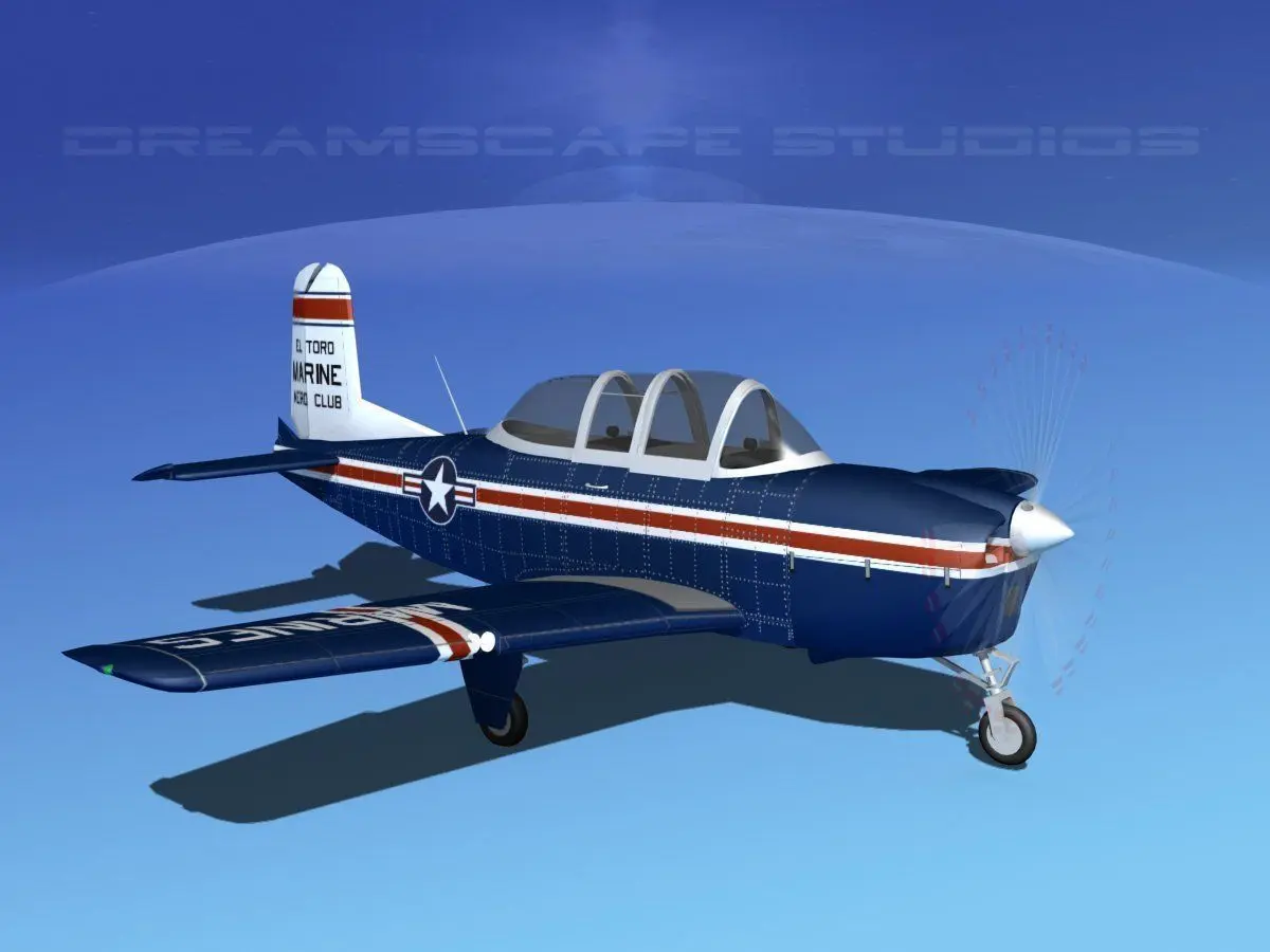 Beechcraft T-34 Mentor V18 USMC This model was originally built in Max 7 in 2006. It is near to scale (within 3-4% of scale) and fully textured. It has been updated using Max 11 in 2017 with high quality smoother mesh, more detail, better cockpits, better textures and higher quality diffuse mapping. 95 percent of all the mesh has been replaced or heavily modified. It comes with all the materials and textures shown in renderings here. It is available in several formats for a wide variety of end users. This model comes with many different liveries. It is built to be used in in-flight or airport ground animations and video or simulation. It can also be used to populate an airport scene. The model has animated propeller. It also has animateable ailerons, flaps, rudder, and elevators. The cockpit is semi detailed including control yokes grips engine controls rudder pedals seating and instrument panel. This model also has animated control surfaces including ailerons, elevators, rudder and flaps. These are animated through their nominal range of motion. In addition the propeller is animated at idle speed.
