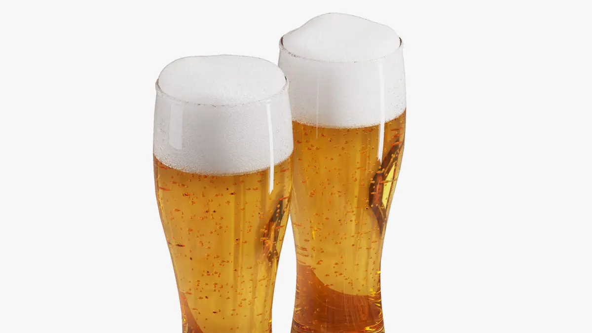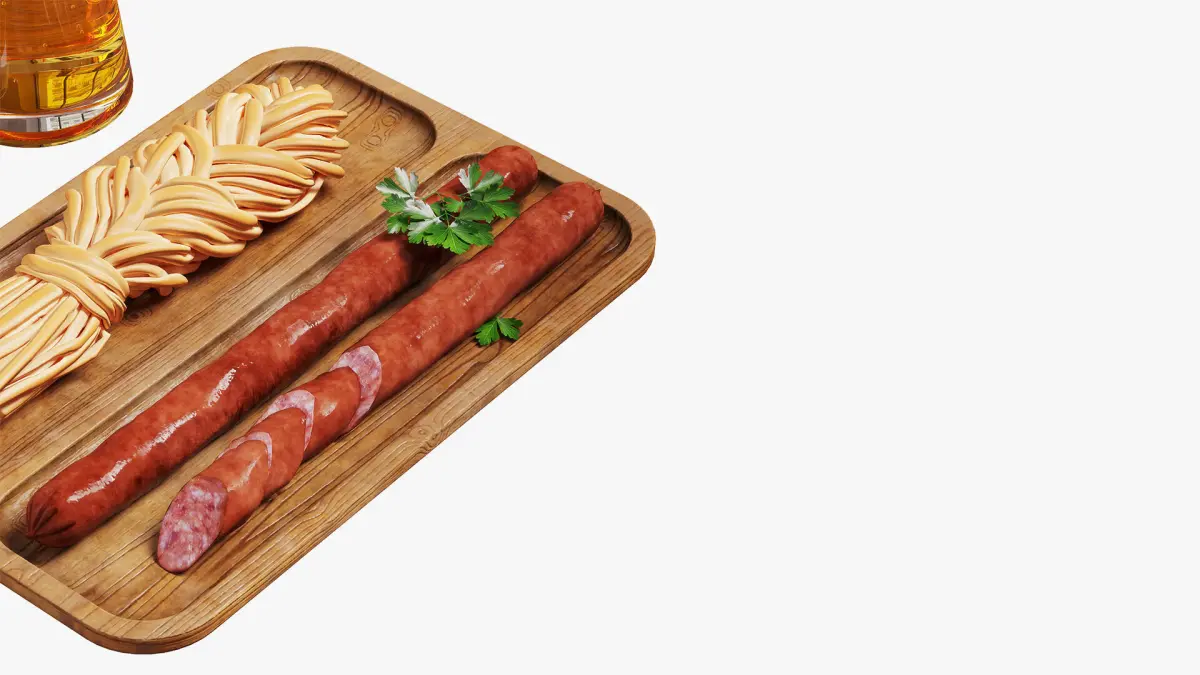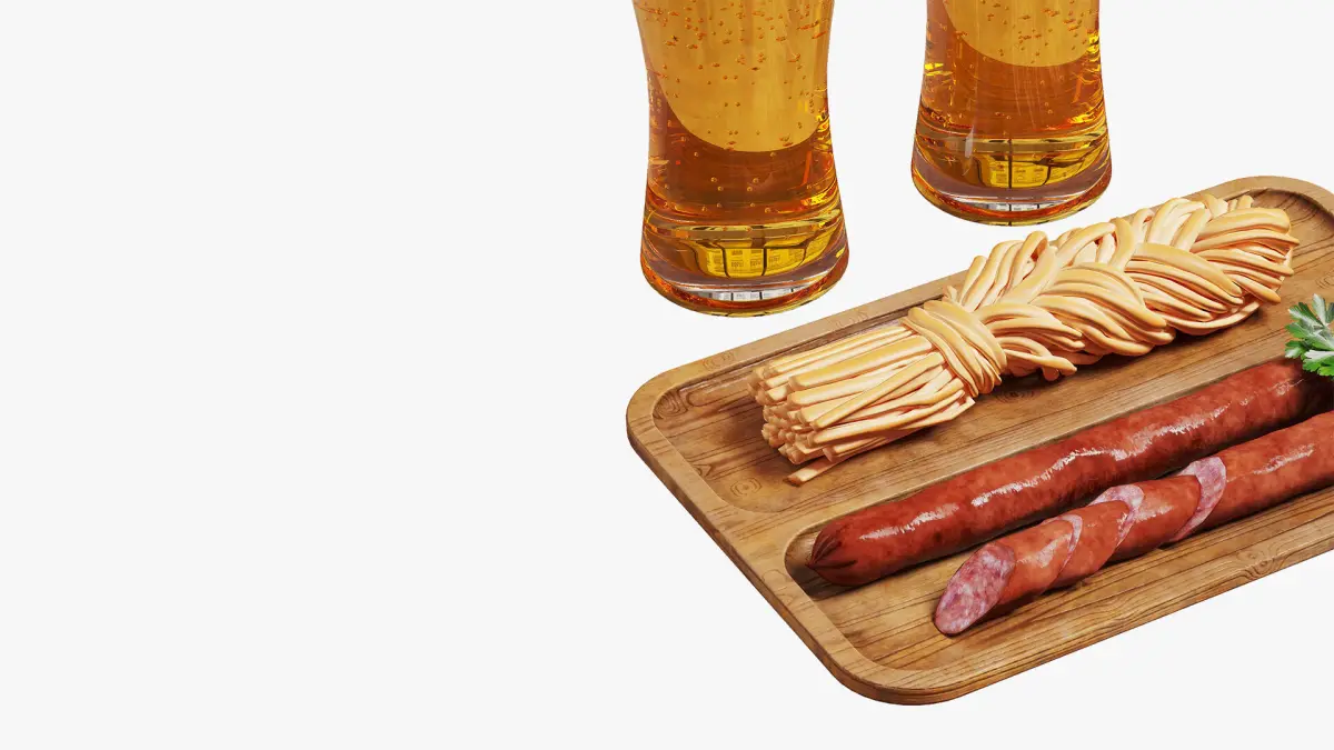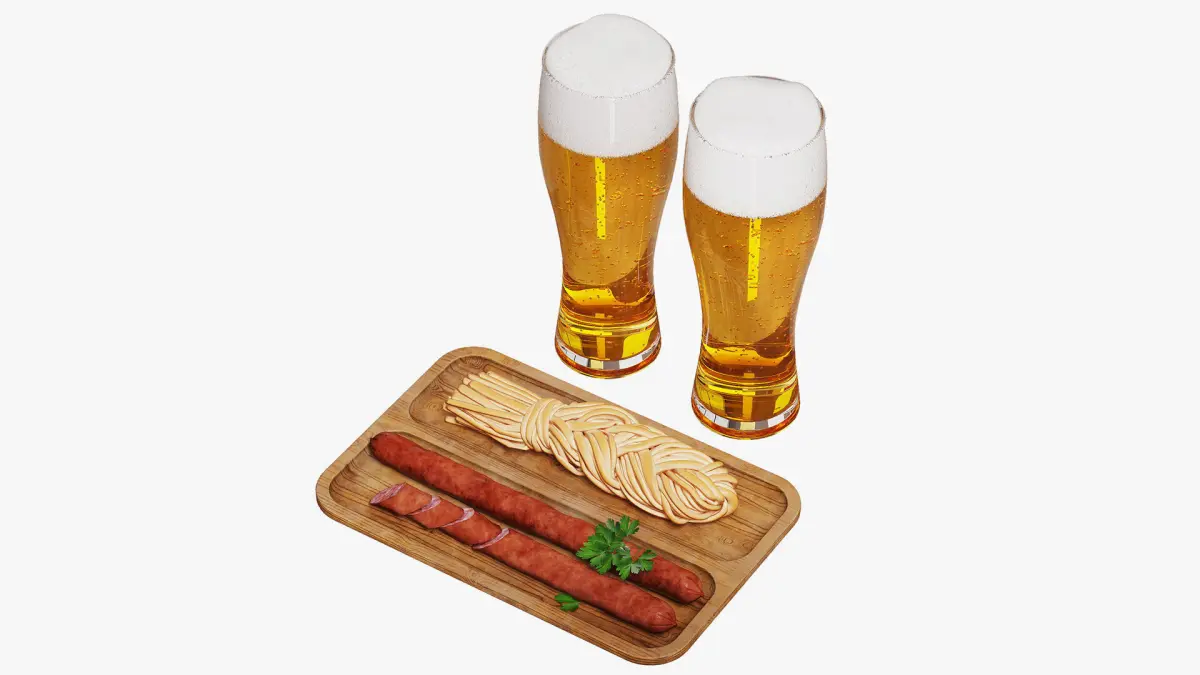 The set includes two beer glasses with light beer. There is also a wooden tray board with scuffs, a braid of chechil cheese, and two hunting sausages. One of the sausages is cut and decorated with a sprig of parsley.Material settings based on mixing two colors by mask allow you to conveniently change the color of the braid if necessary.