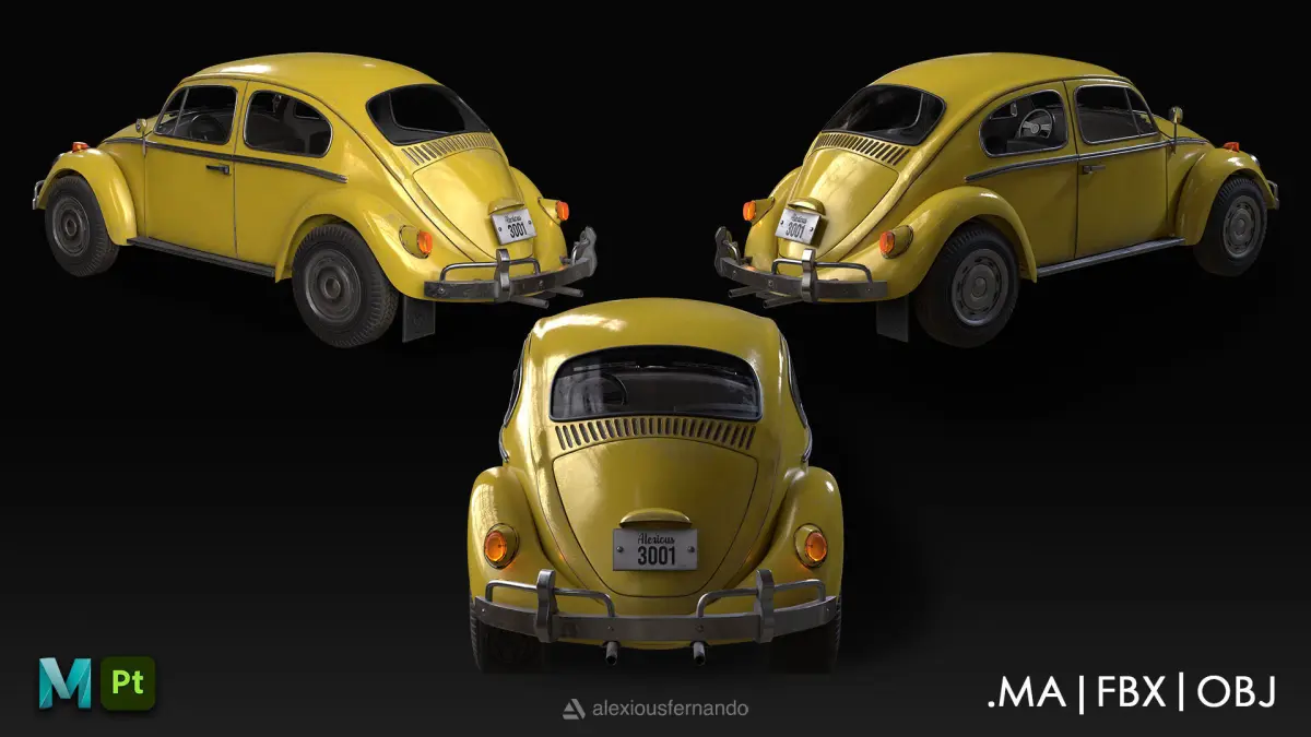 Beetle Car from Volkswagen. Modeled in Autodesk Maya, UV Unwrapped in UDIMs and Textured in Substance Painter.This product includes:.MAFBXOBJ2K PBR Textures