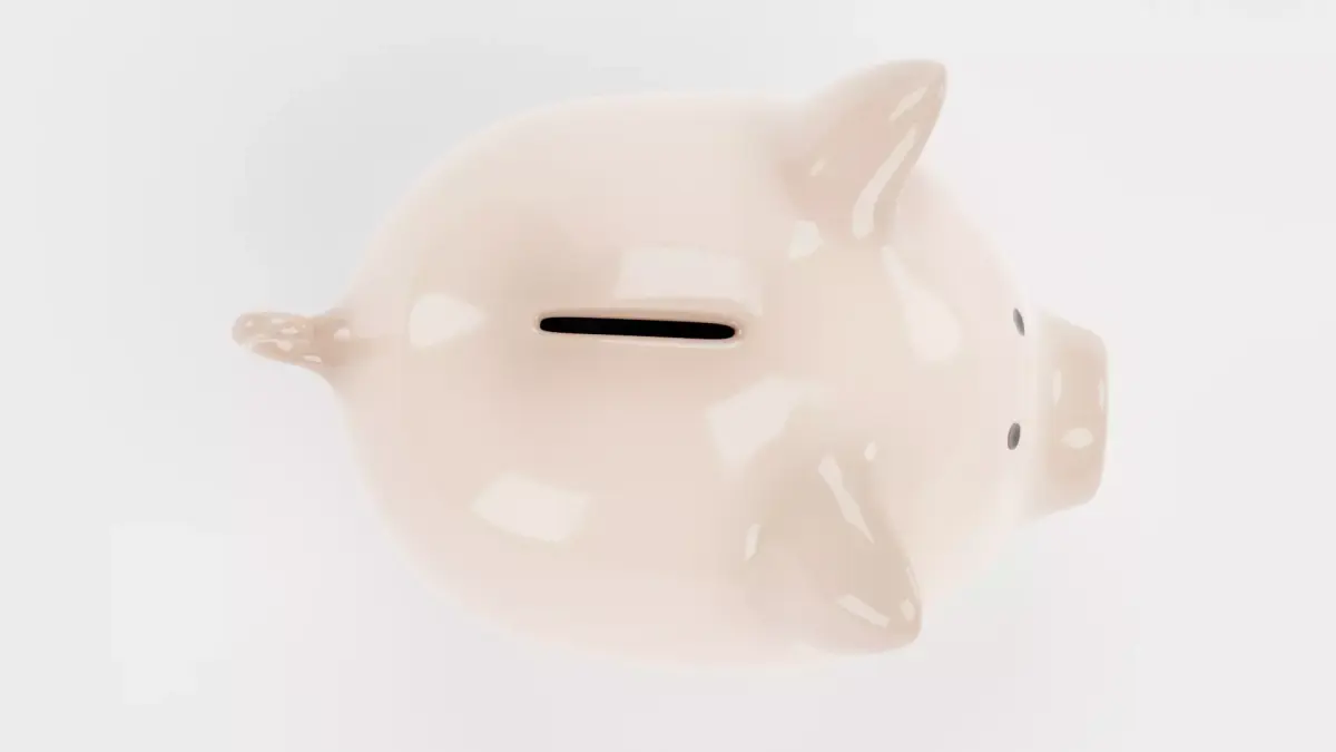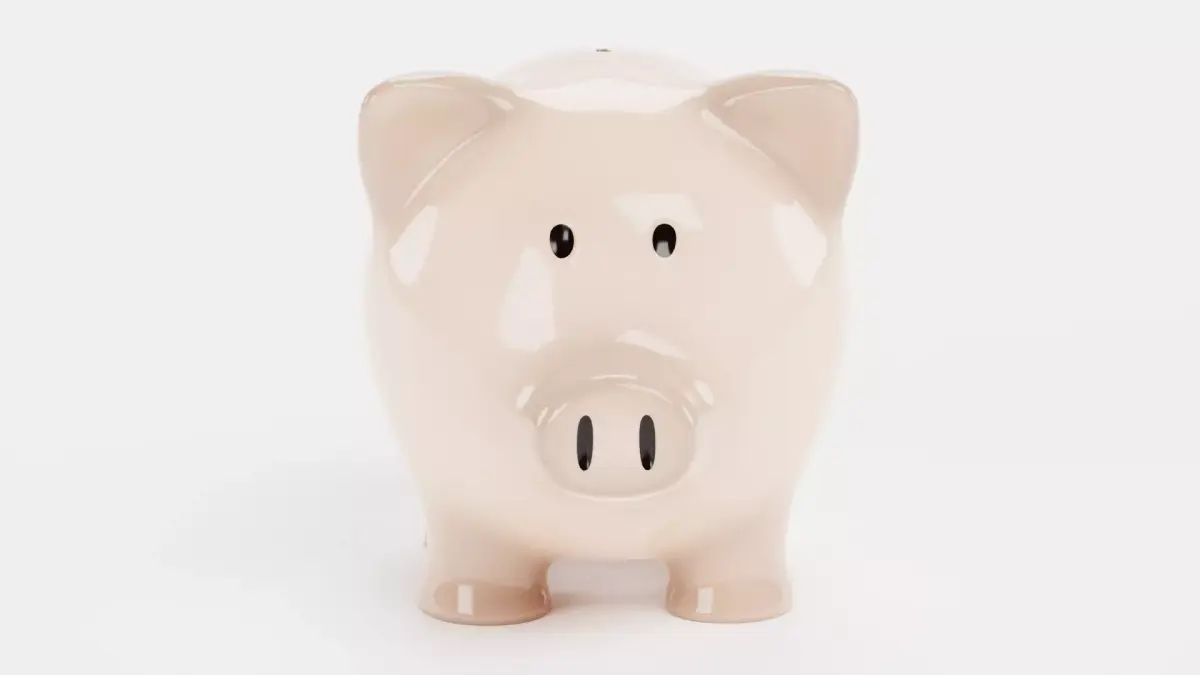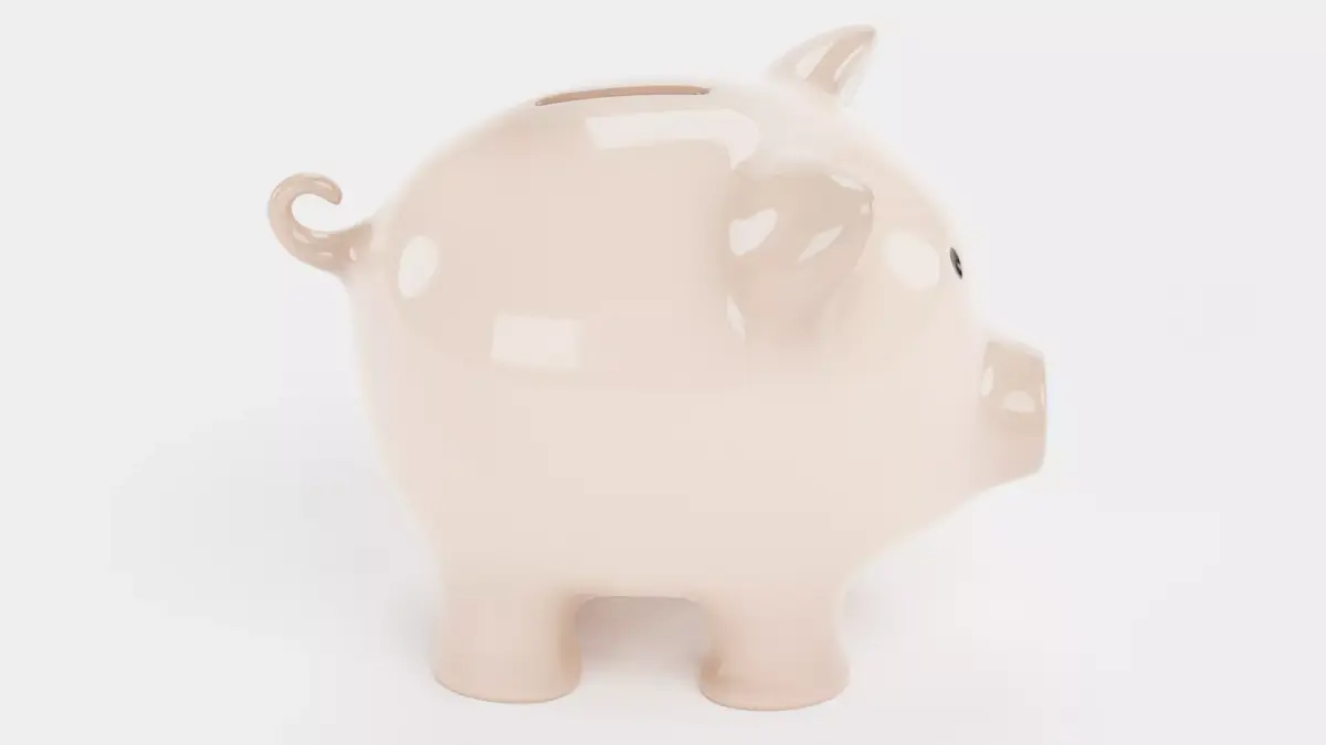 A piggy bank model featuring a smooth, glossy ceramic surface and the classic coin slot on top. The design includes accurate proportions, neutral beige color, and subtle stylization of a believable savings bank or economic symbol.