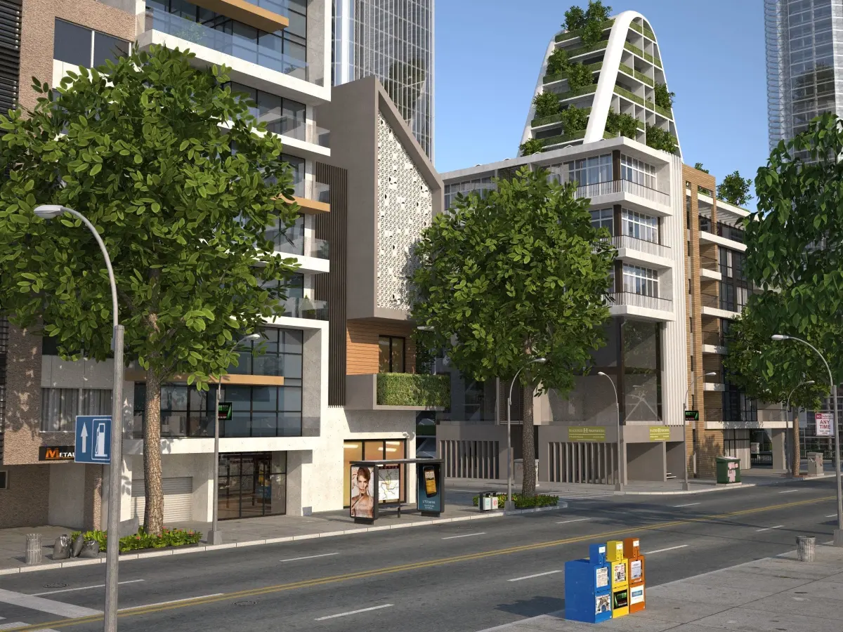 Highly detailed modular city containing detailed buildings, road tiles, street furniture, textures and more.