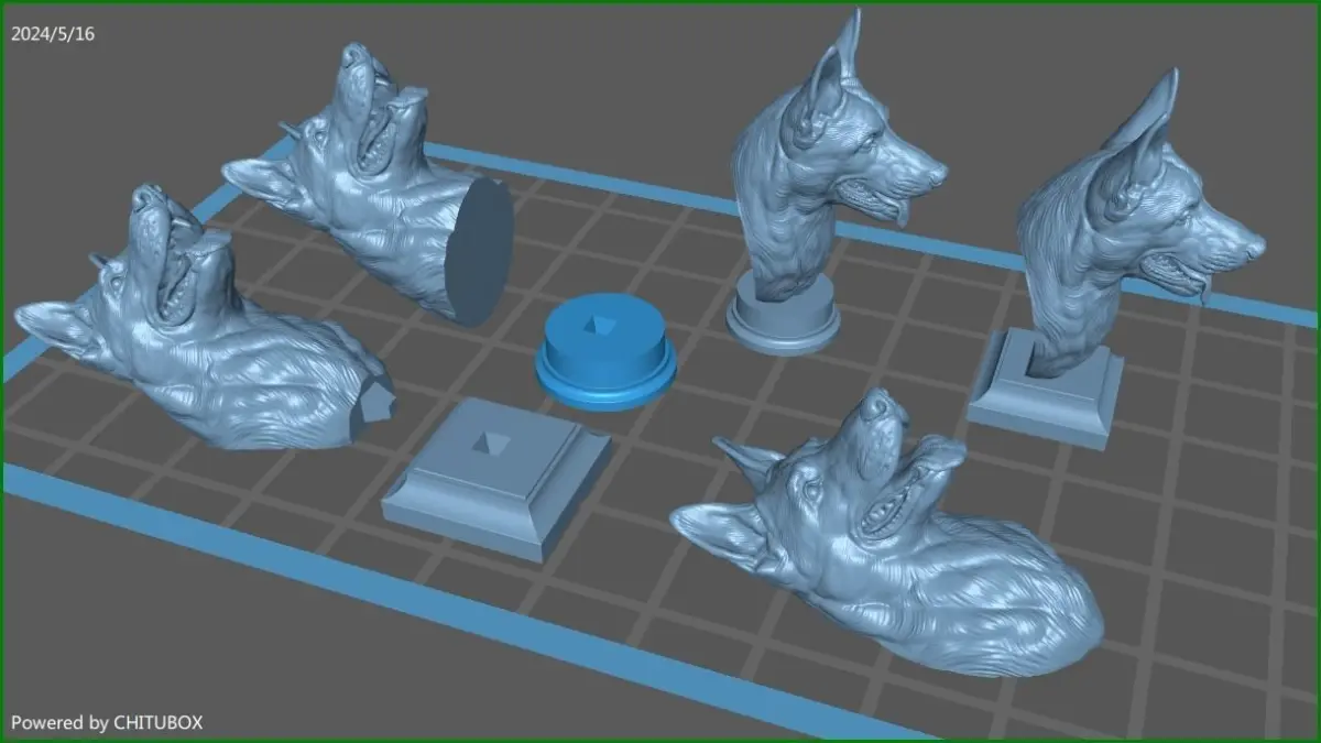 520K STL, OBJ triangulated mesh, Belgian Shepherd Malinois bust on the base in parts