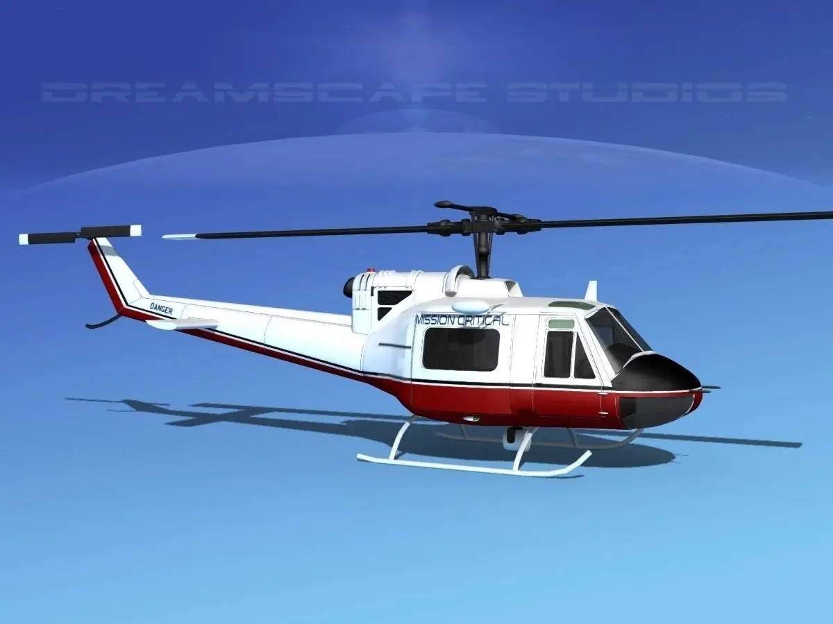 Bell 204 Mission Critical This model was built near to scale. The model is fully textured. It comes with all materials and textures as shown. The main rotor and tail rotor are animateable. The side loading doors and crew doors can be closed and opened to reveal some good detail in the cabin and cockpit. The pilot and copilots seats include the armor and controls. The instrument panel is viewable from outside of the model. The rotors are somewhat detailed. The cabin includes the military light seats. These models come in several formats for immediate downloading.