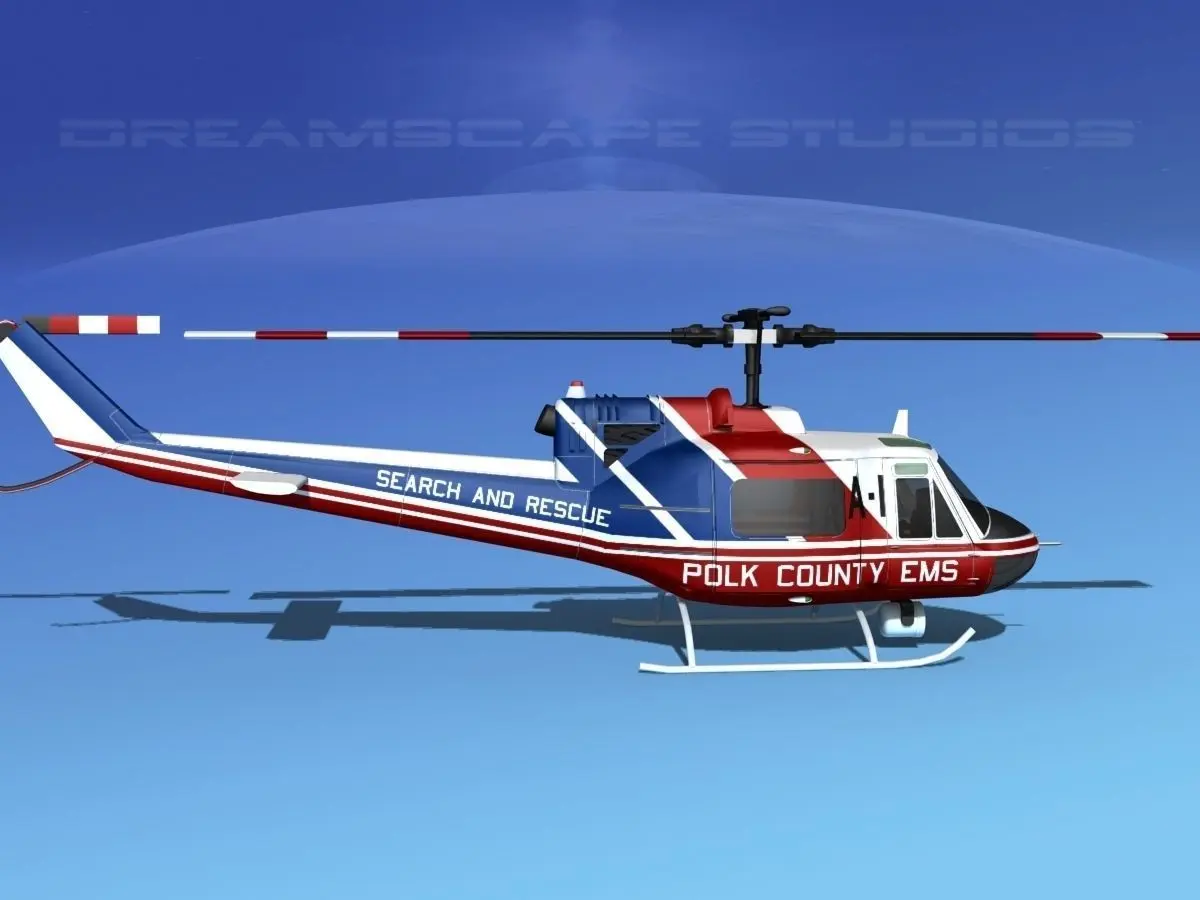 Bell 204 Polk County EMS This model was built near to scale. The model is fully textured. It comes with all materials and textures as shown. The main rotor and tail rotor are animateable. The side loading doors and crew doors can be closed and opened to reveal some good detail in the cabin and cockpit. The pilot and copilots seats include the armor and controls. The instrument panel is viewable from outside of the model. The rotors are somewhat detailed. The cabin includes the military light seats. These models come in several formats for immediate downloading.