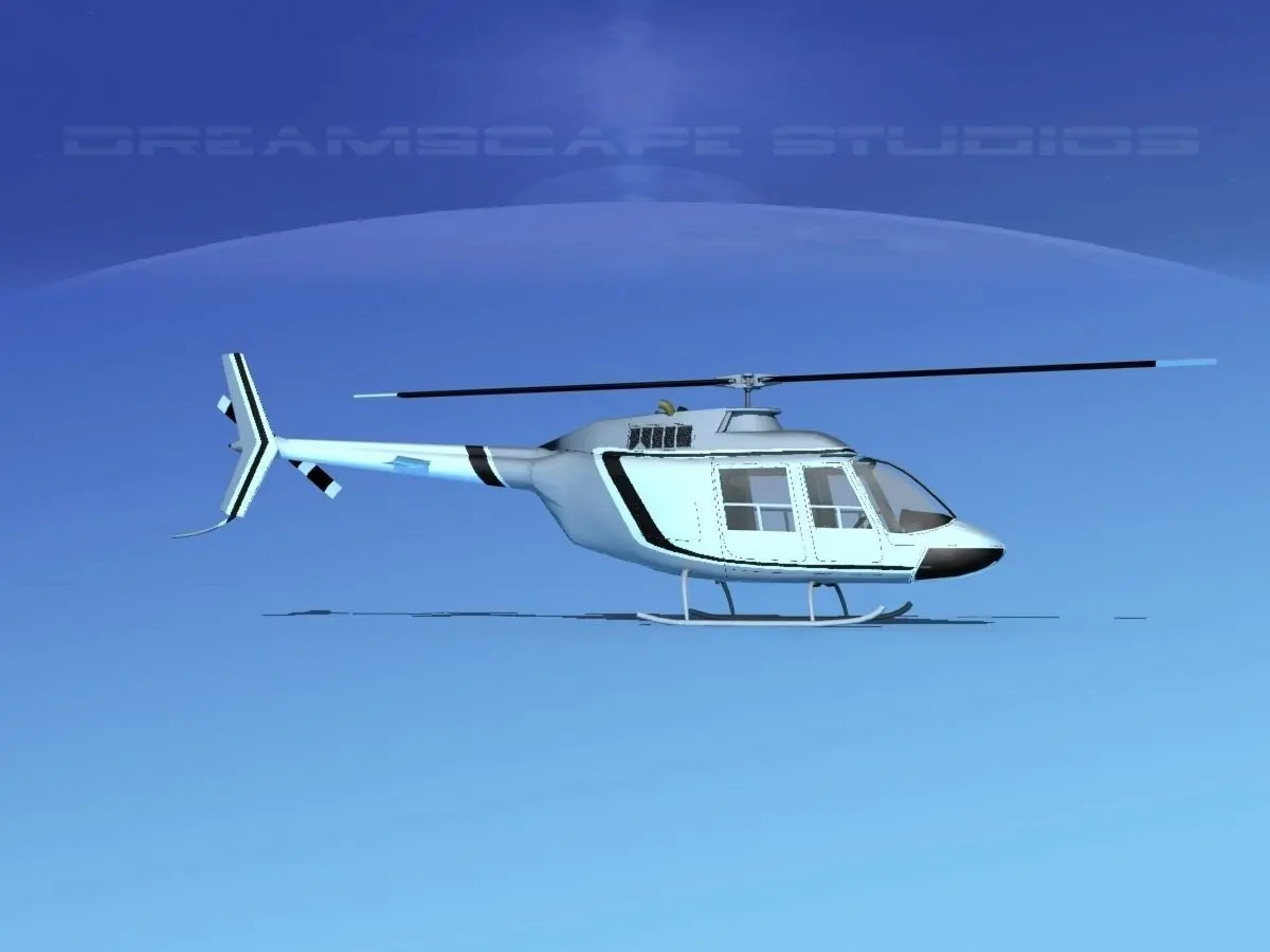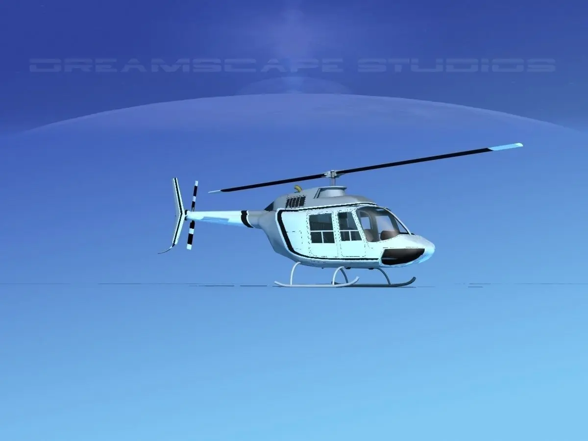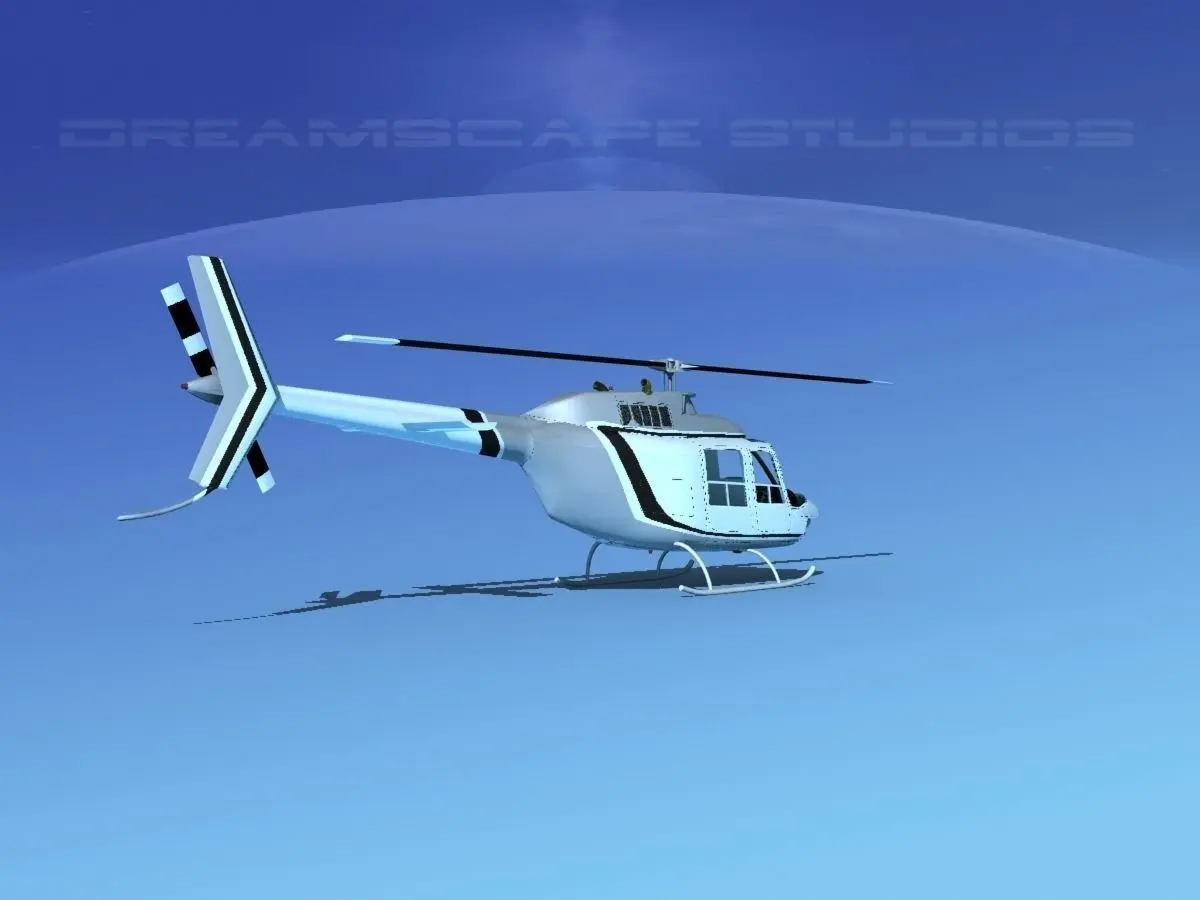 Bell 206 JetRanger V01 This model was originally built in Max 13 near to scale (within 3-4% of scale) and fully textured. It comes with all the materials and textures shown in renderings here. It is available in several formats for a wide variety of end users. This model comes with many different liveries. It is built to be used in in-flight or airport ground animations and video or simulation. It can also be used to populate an airport scene. The model has animated rotor and tail-rotor. The cockpit is semi detailed including control yoke, cyclic, rudder pedals, seating and instrument panel.