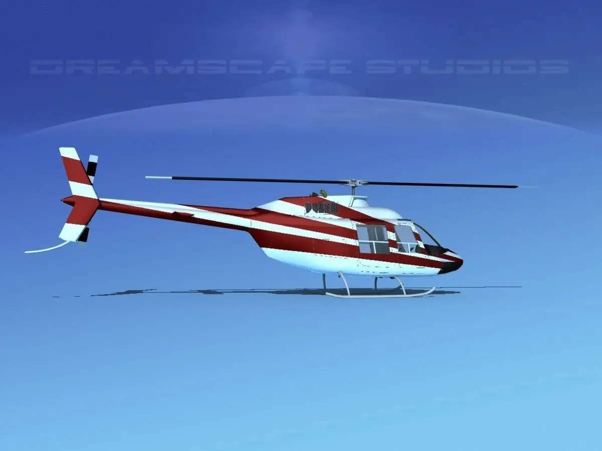Bell 206 JetRanger V02 This model was originally built in Max 13 near to scale (within 3-4% of scale) and fully textured. It comes with all the materials and textures shown in renderings here. It is available in several formats for a wide variety of end users. This model comes with many different liveries. It is built to be used in in-flight or airport ground animations and video or simulation. It can also be used to populate an airport scene. The model has animated rotor and tail-rotor. The cockpit is semi detailed including control yoke, cyclic, rudder pedals, seating and instrument panel.