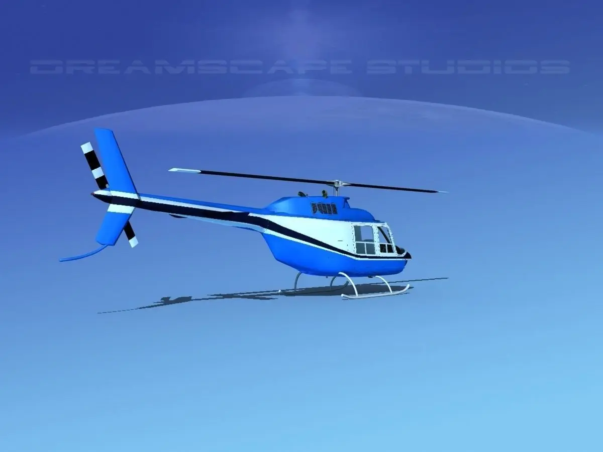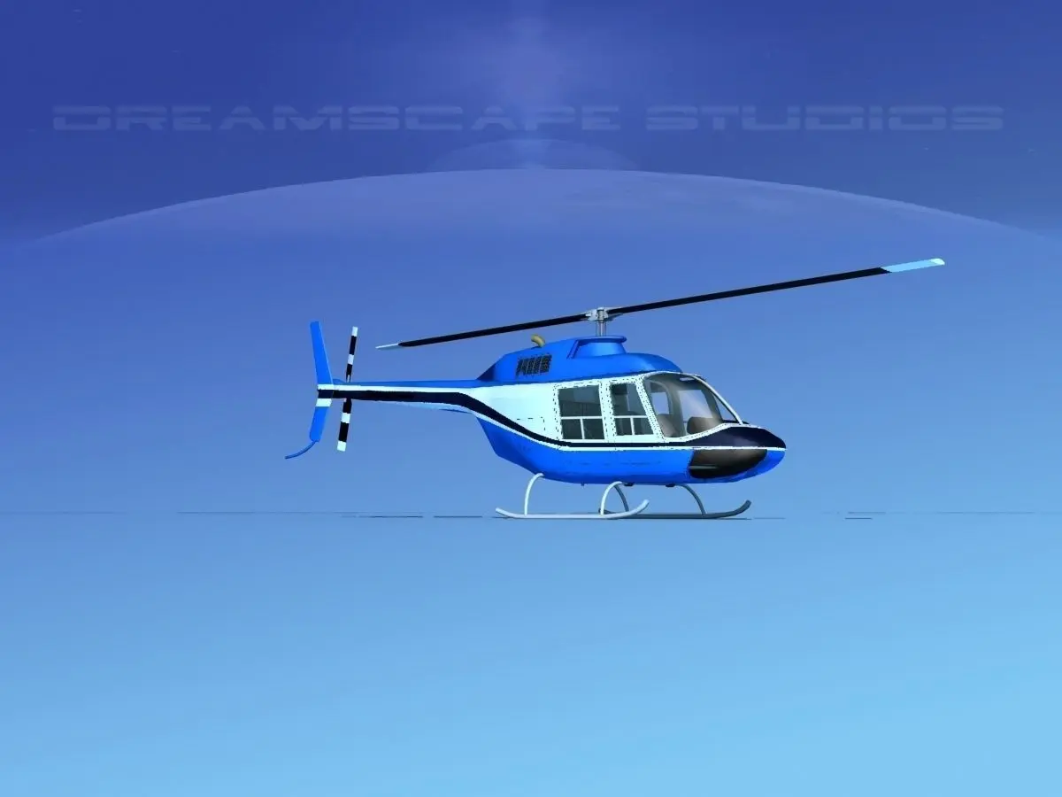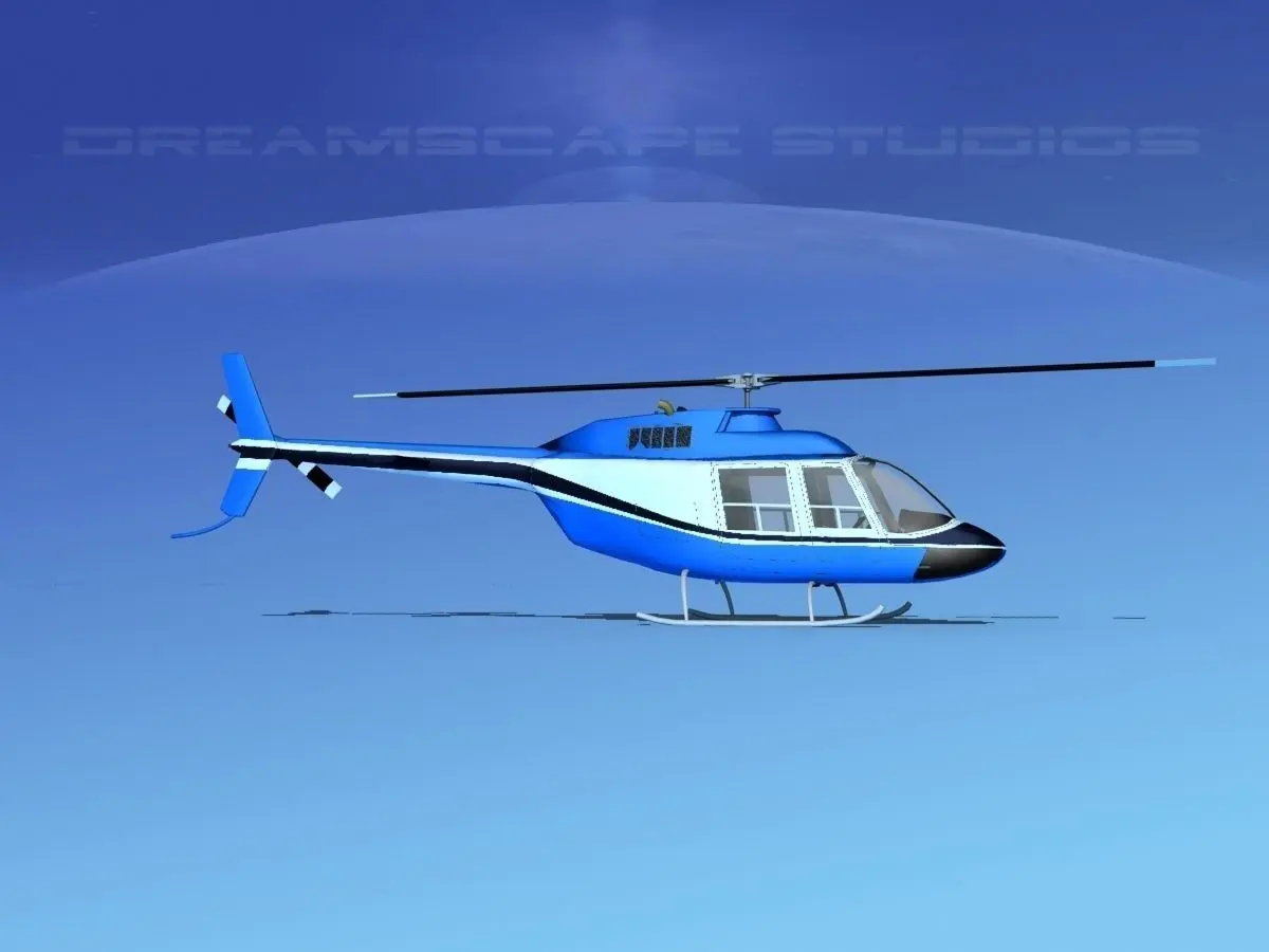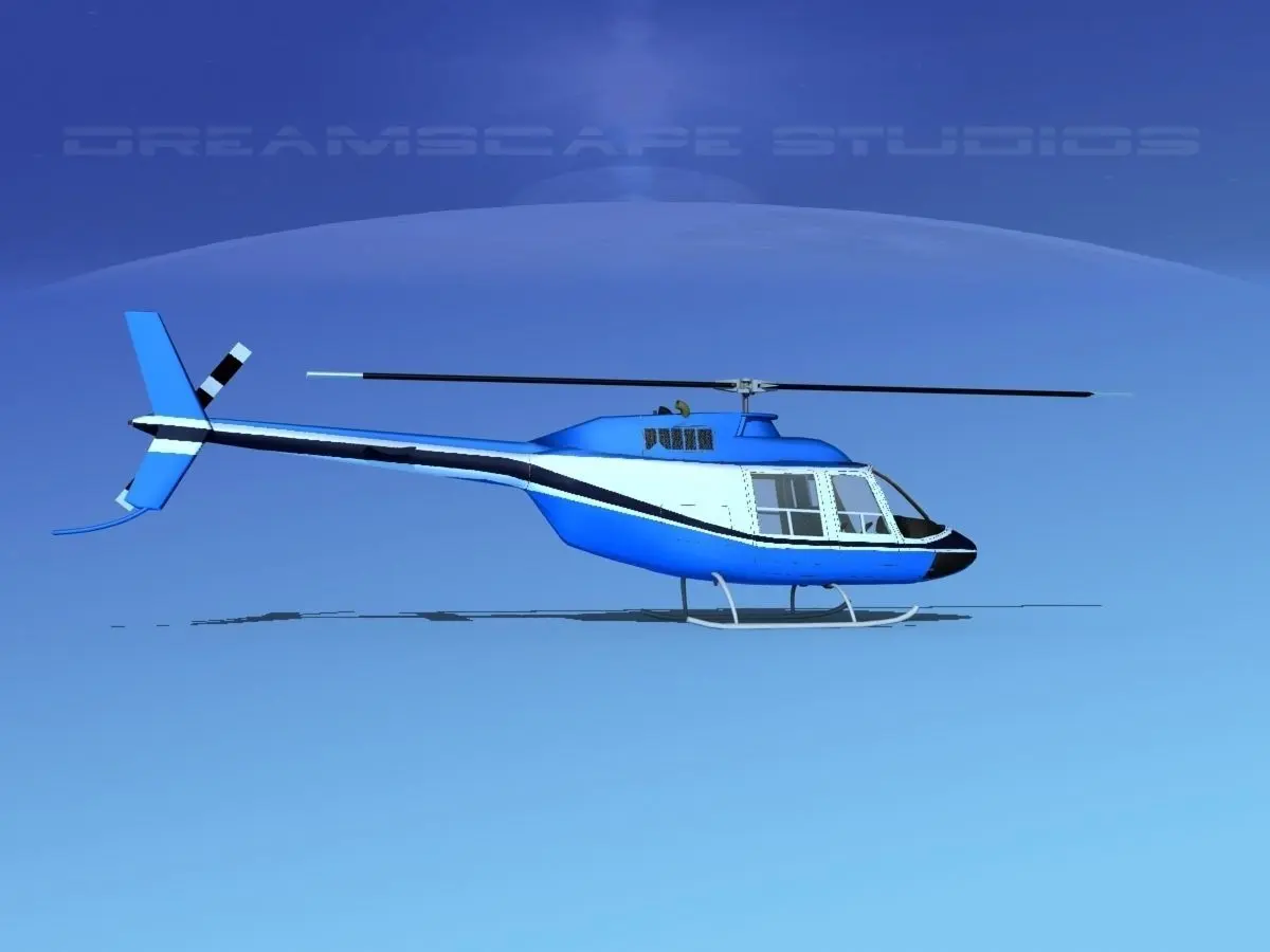 Bell 206 JetRanger V05 This model was originally built in Max 13 near to scale (within 3-4% of scale) and fully textured. It comes with all the materials and textures shown in renderings here. It is available in several formats for a wide variety of end users. This model comes with many different liveries. It is built to be used in in-flight or airport ground animations and video or simulation. It can also be used to populate an airport scene. The model has animated rotor and tail-rotor. The cockpit is semi detailed including control yoke, cyclic, rudder pedals, seating and instrument panel.