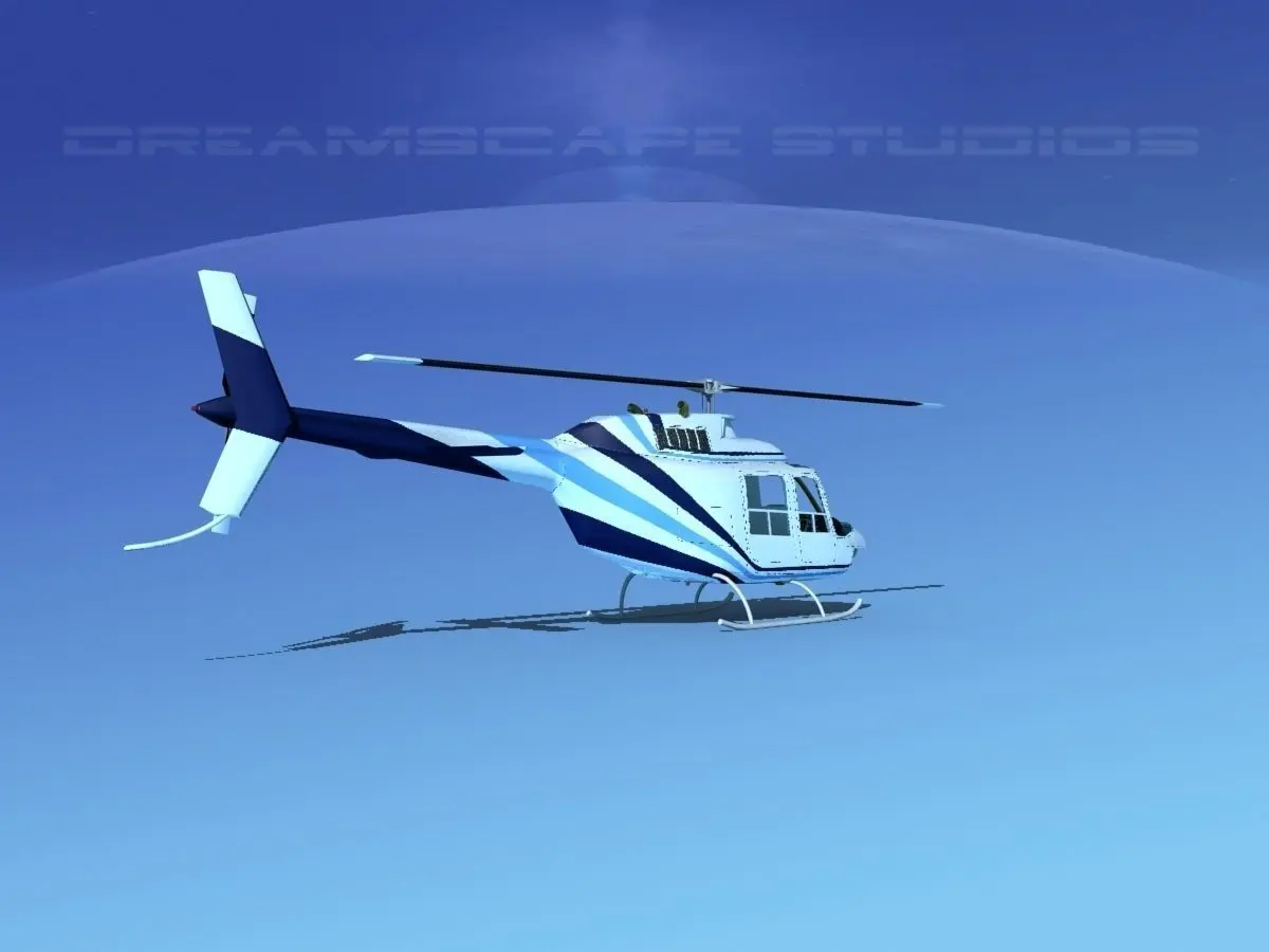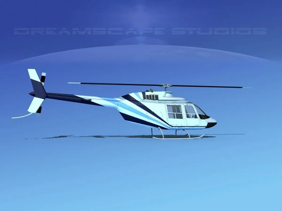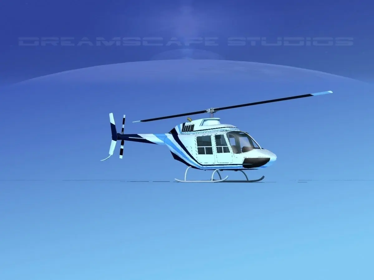 Bell 206 JetRanger V06 This model was originally built in Max 13 near to scale (within 3-4% of scale) and fully textured. It comes with all the materials and textures shown in renderings here. It is available in several formats for a wide variety of end users. This model comes with many different liveries. It is built to be used in in-flight or airport ground animations and video or simulation. It can also be used to populate an airport scene. The model has animated rotor and tail-rotor. The cockpit is semi detailed including control yoke, cyclic, rudder pedals, seating and instrument panel.