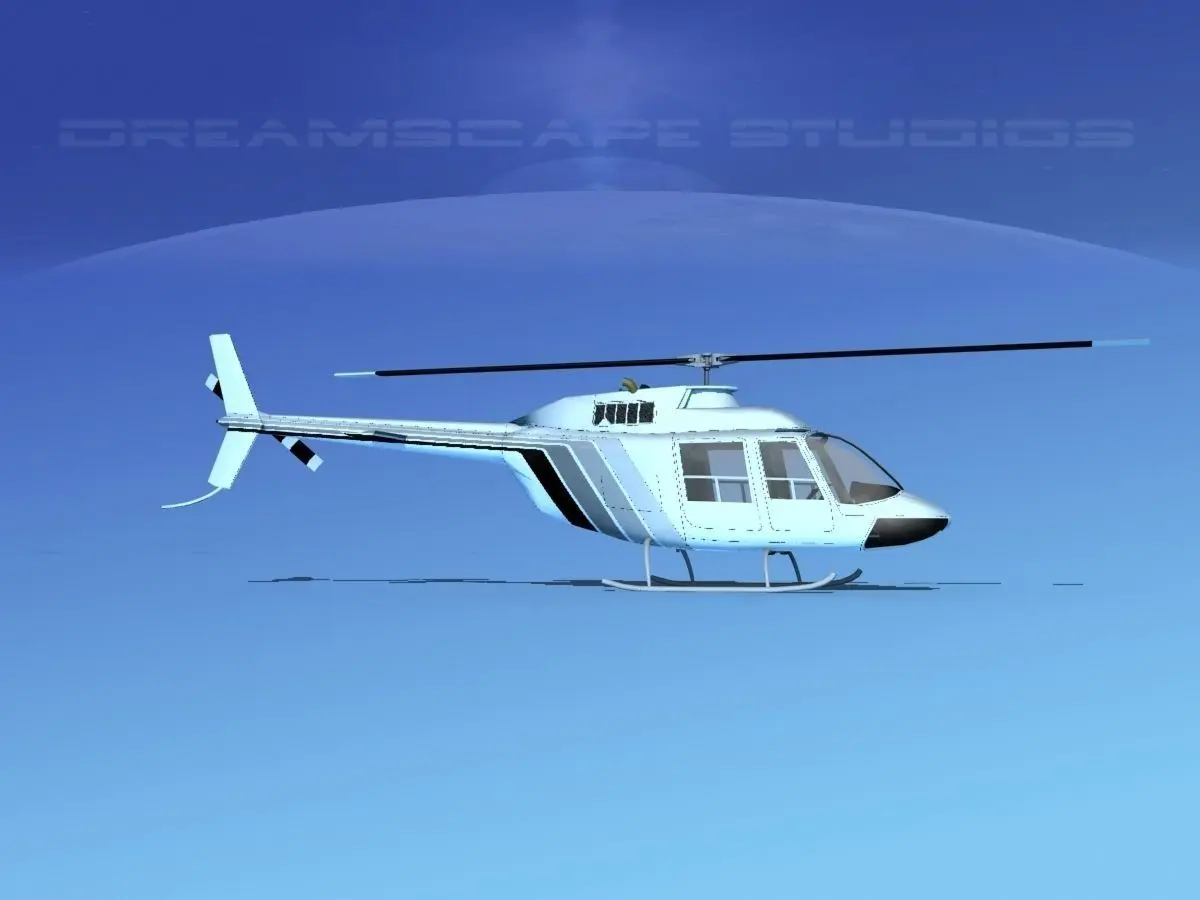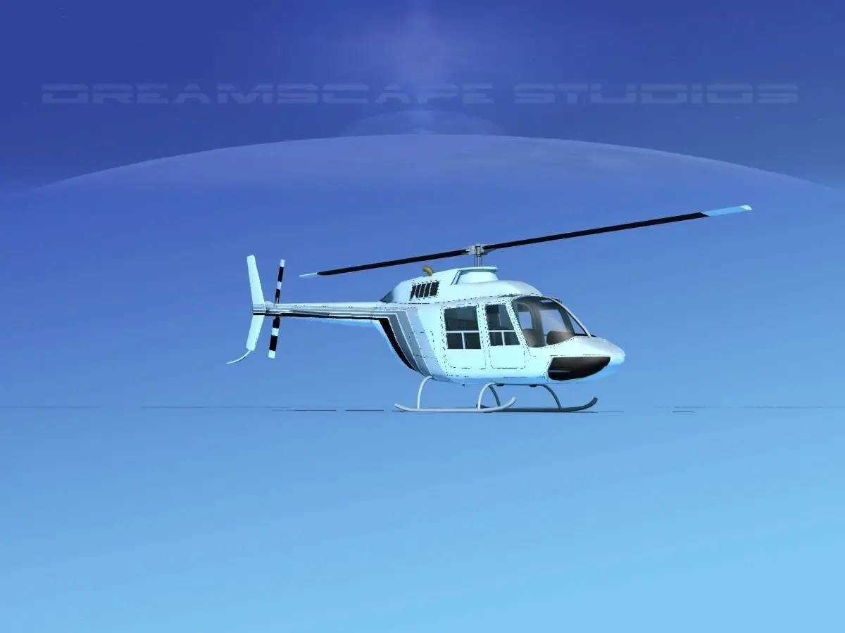 Bell 206 JetRanger V18 This model was originally built in Max 13 near to scale (within 3-4% of scale) and fully textured. It comes with all the materials and textures shown in renderings here. It is available in several formats for a wide variety of end users. This model comes with many different liveries. It is built to be used in in-flight or airport ground animations and video or simulation. It can also be used to populate an airport scene. The model has animated rotor and tail-rotor. The cockpit is semi detailed including control yoke, cyclic, rudder pedals, seating and instrument panel.