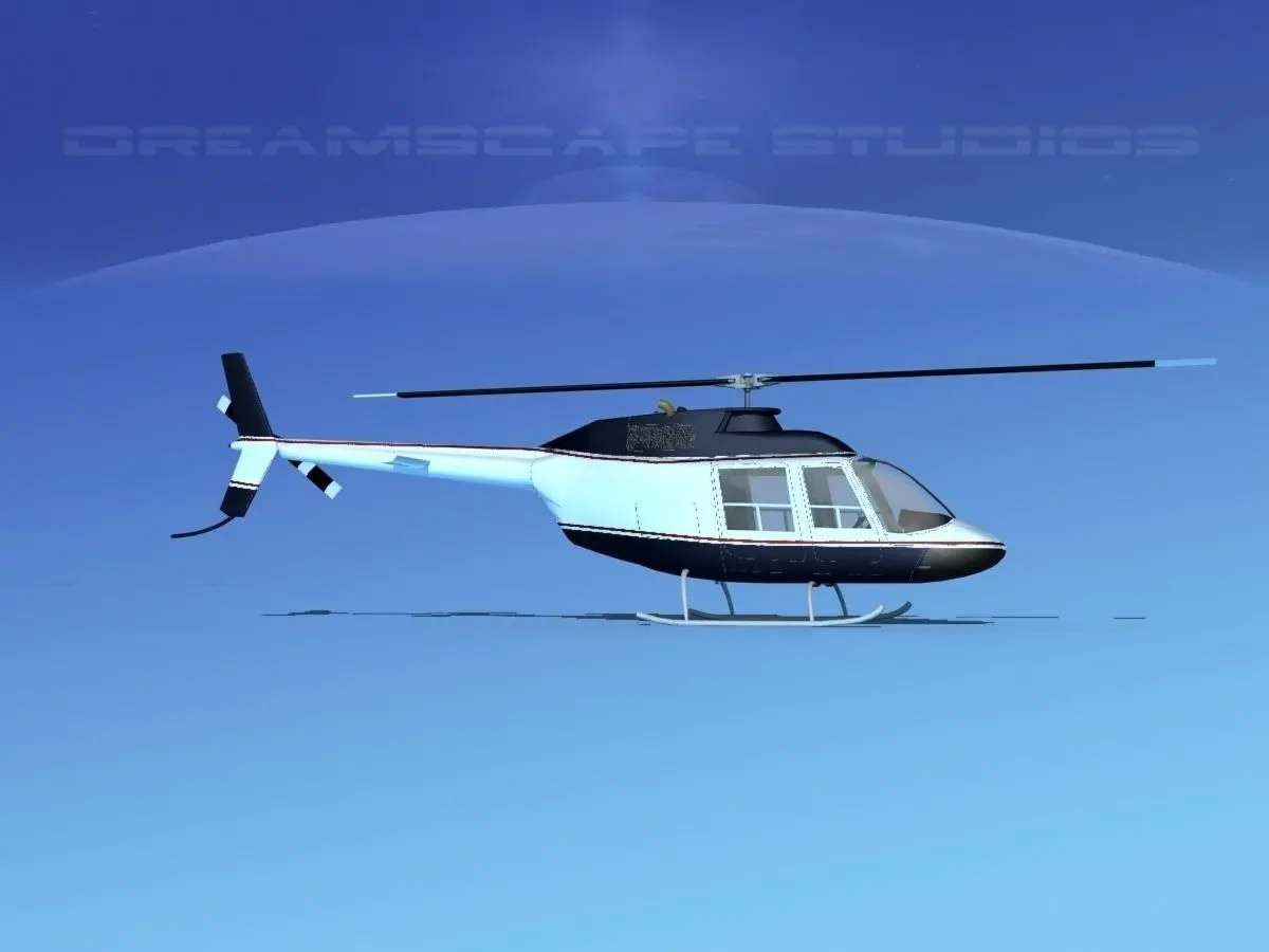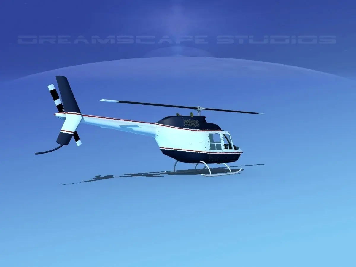 Bell 206 JetRanger V19 This model was originally built in Max 13 near to scale (within 3-4% of scale) and fully textured. It comes with all the materials and textures shown in renderings here. It is available in several formats for a wide variety of end users. This model comes with many different liveries. It is built to be used in in-flight or airport ground animations and video or simulation. It can also be used to populate an airport scene. The model has animated rotor and tail-rotor. The cockpit is semi detailed including control yoke, cyclic, rudder pedals, seating and instrument panel.