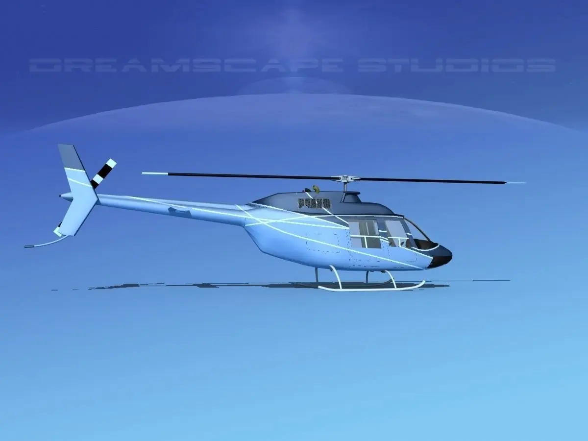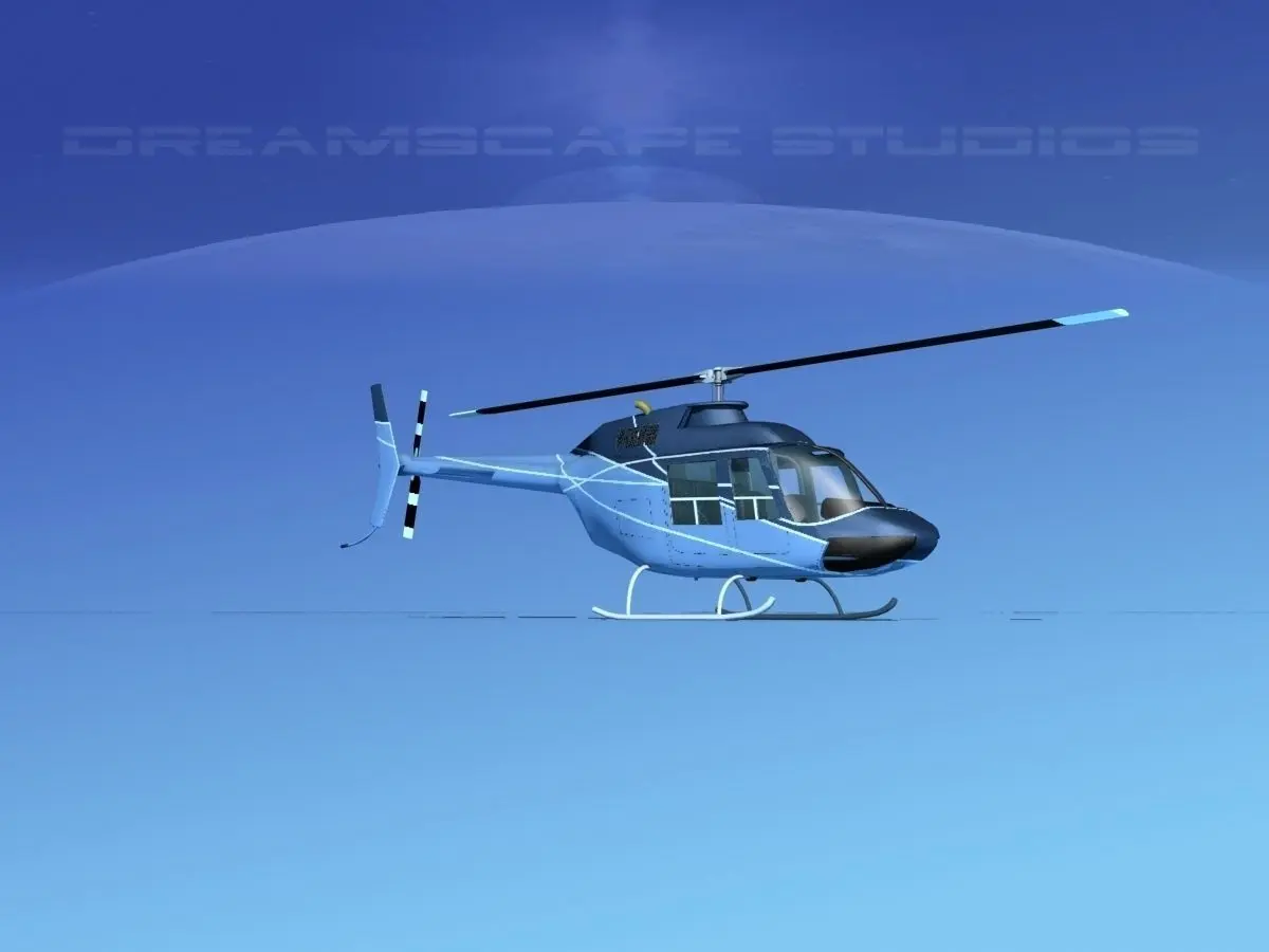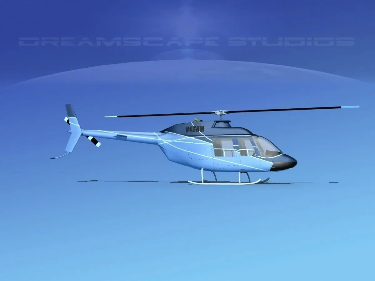 Bell 206 JetRanger V21 This model was originally built in Max 13 near to scale (within 3-4% of scale) and fully textured. It comes with all the materials and textures shown in renderings here. It is available in several formats for a wide variety of end users. This model comes with many different liveries. It is built to be used in in-flight or airport ground animations and video or simulation. It can also be used to populate an airport scene. The model has animated rotor and tail-rotor. The cockpit is semi detailed including control yoke, cyclic, rudder pedals, seating and instrument panel.