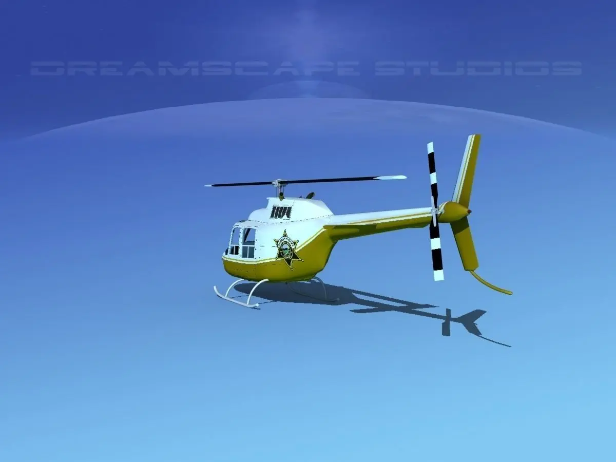 Bell 206 Sheriff Department This model was originally built in Max 13 near to scale (within 3-4% of scale) and fully textured. It comes with all the materials and textures shown in renderings here. It is available in several formats for a wide variety of end users. This model comes with many different liveries. It is built to be used in in-flight or airport ground animations and video or simulation. It can also be used to populate an airport scene. The model has animated rotor and tail-rotor. The cockpit is semi detailed including control yoke, cyclic, rudder pedals, seating and instrument panel.