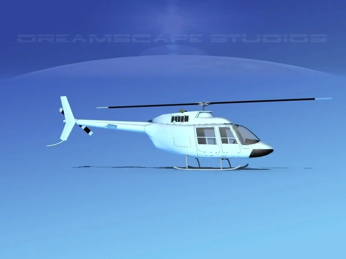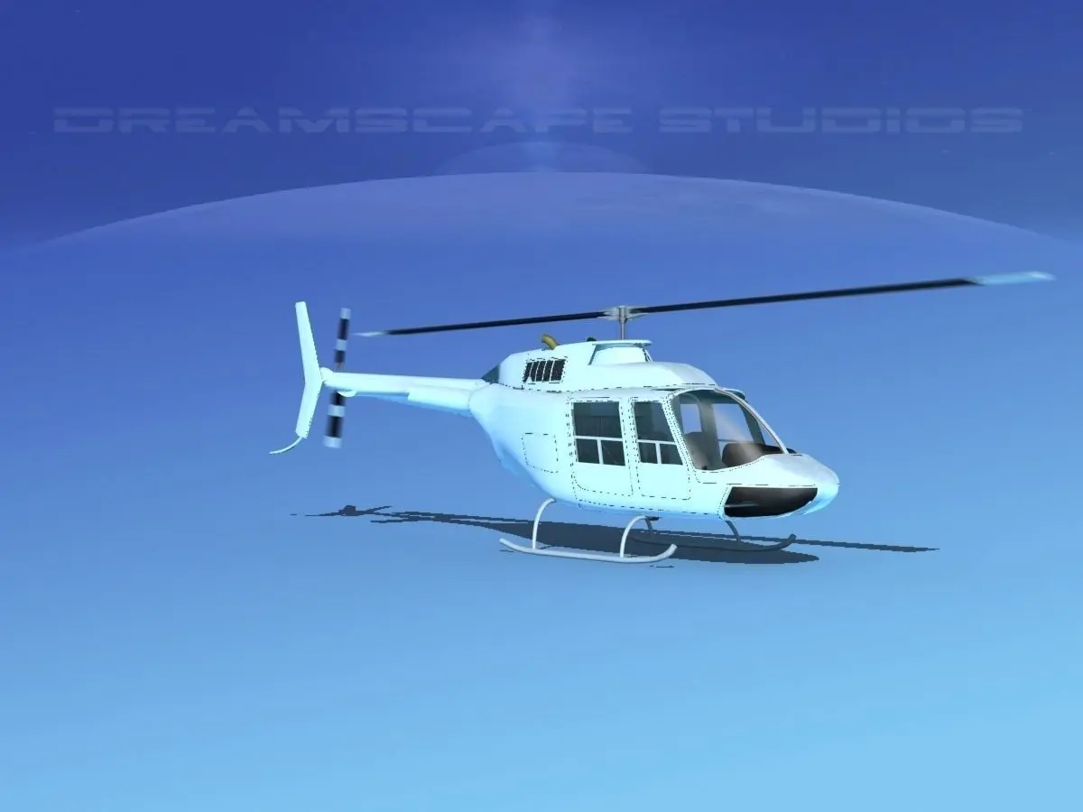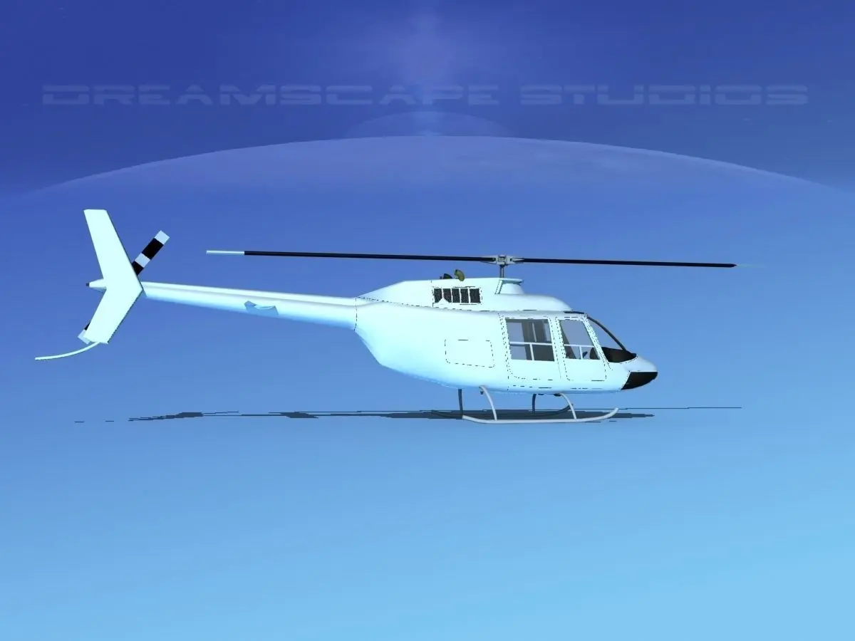 Bell 206 Unmarked This model was originally built in Max 13 near to scale (within 3-4% of scale) and fully textured. It comes with all the materials and textures shown in renderings here. It is available in several formats for a wide variety of end users. This model comes with many different liveries. It is built to be used in in-flight or airport ground animations and video or simulation. It can also be used to populate an airport scene. The model has animated rotor and tail-rotor. The cockpit is semi detailed including control yoke, cyclic, rudder pedals, seating and instrument panel.