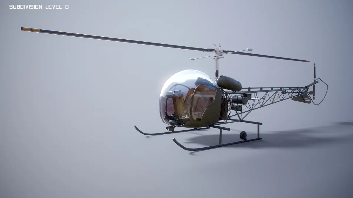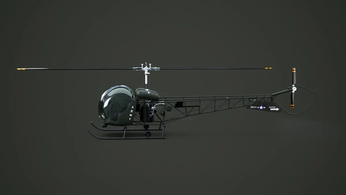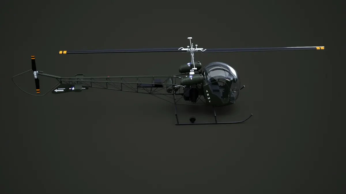 Detailed Bell 47/H-13 Light military light helicopter 3D model with full PBR textures, accurate frame construction, realistic cockpit, and clean topology.
