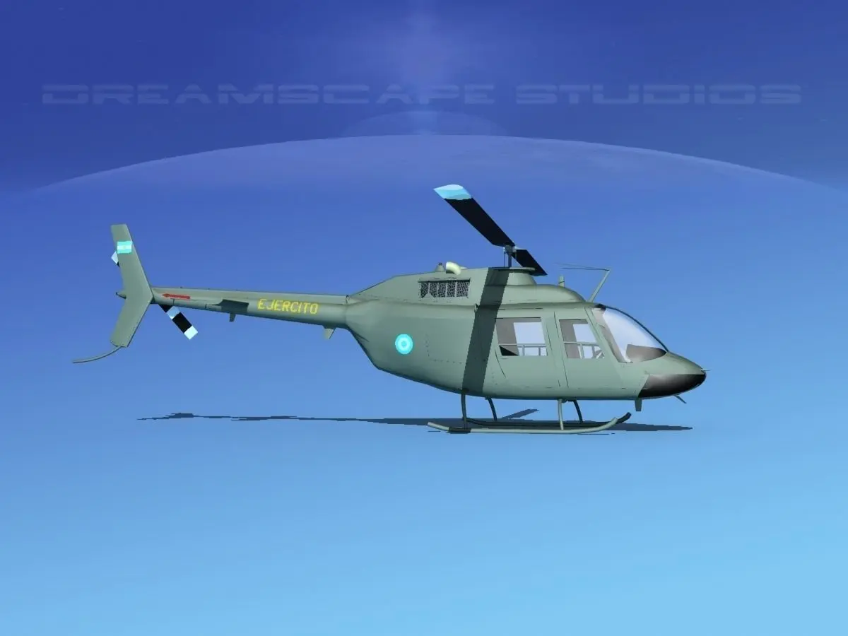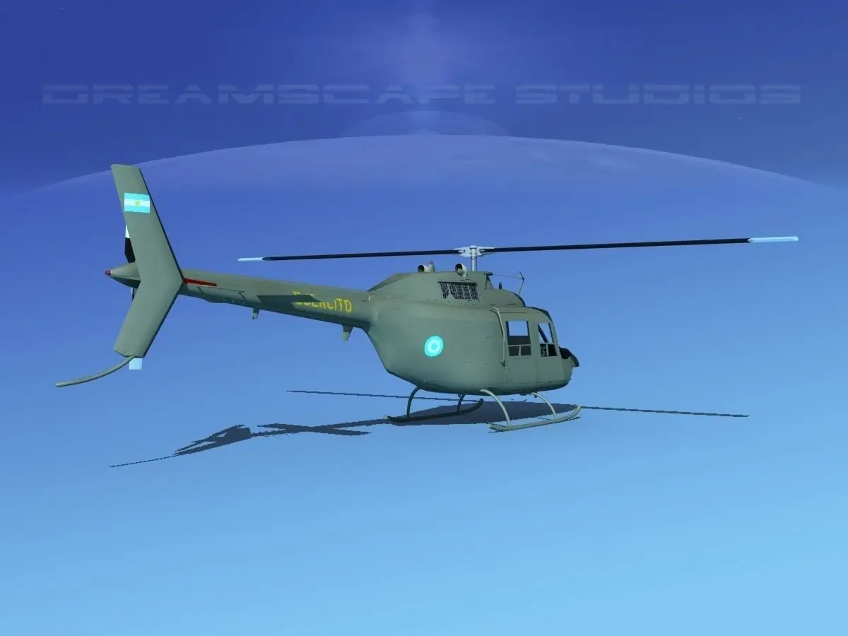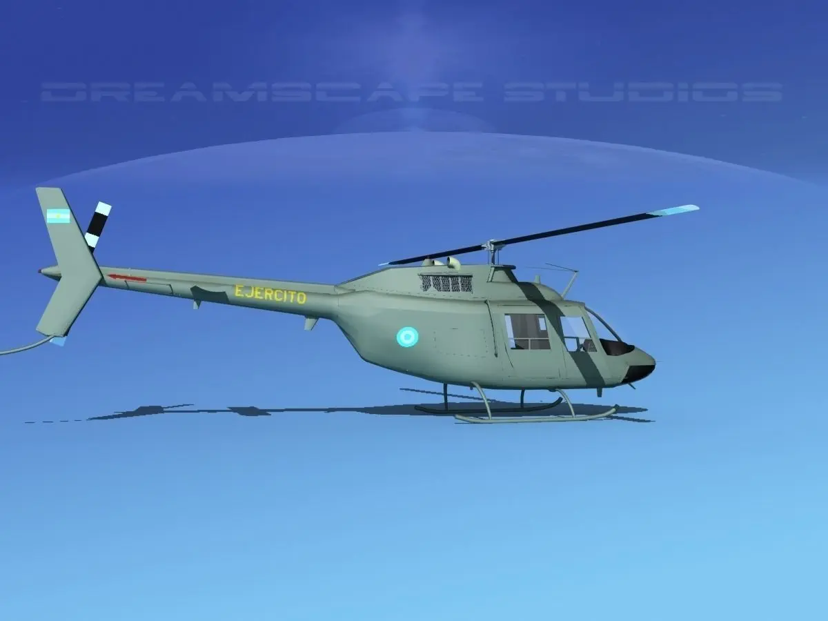 Bell OH-58B Argentina Army This model was originally built in Max 13 near to scale (within 3-4% of scale) and fully textured. It comes with all the materials and textures shown in renderings here. It is available in several formats for a wide variety of end users. This model comes with many different liveries. It is built to be used in in-flight or airport ground animations and video or simulation. It can also be used to populate an airport scene. The model has animated rotor and tail-rotor. The cockpit is semi detailed including control yoke, cyclic, rudder pedals, seating and instrument panel and armored seat panels.