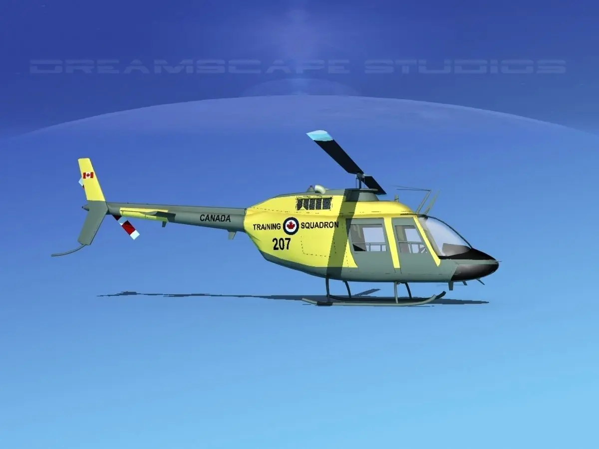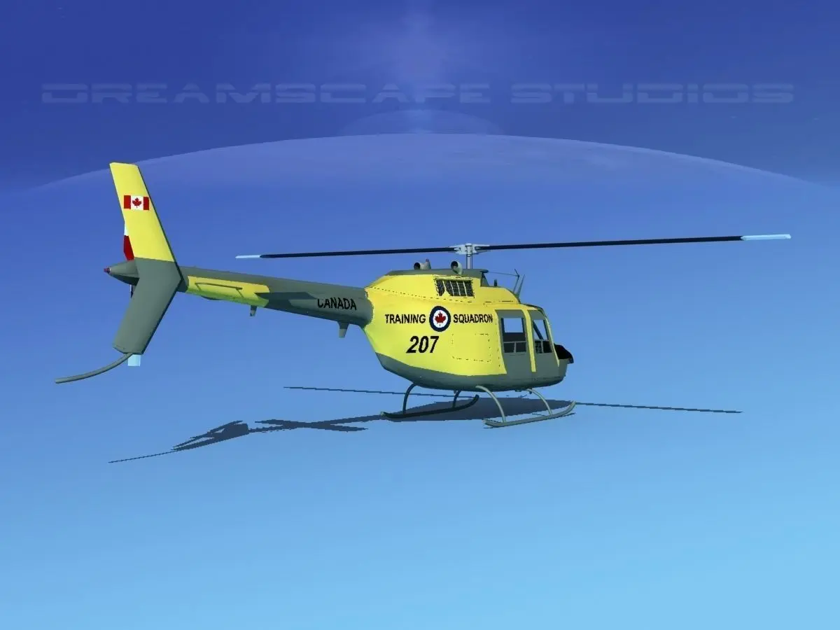 Bell OH-58B Canadian Army 2 This model was originally built in Max 13 near to scale (within 3-4% of scale) and fully textured. It comes with all the materials and textures shown in renderings here. It is available in several formats for a wide variety of end users. This model comes with many different liveries. It is built to be used in in-flight or airport ground animations and video or simulation. It can also be used to populate an airport scene. The model has animated rotor and tail-rotor. The cockpit is semi detailed including control yoke, cyclic, rudder pedals, seating and instrument panel and armored seat panels.