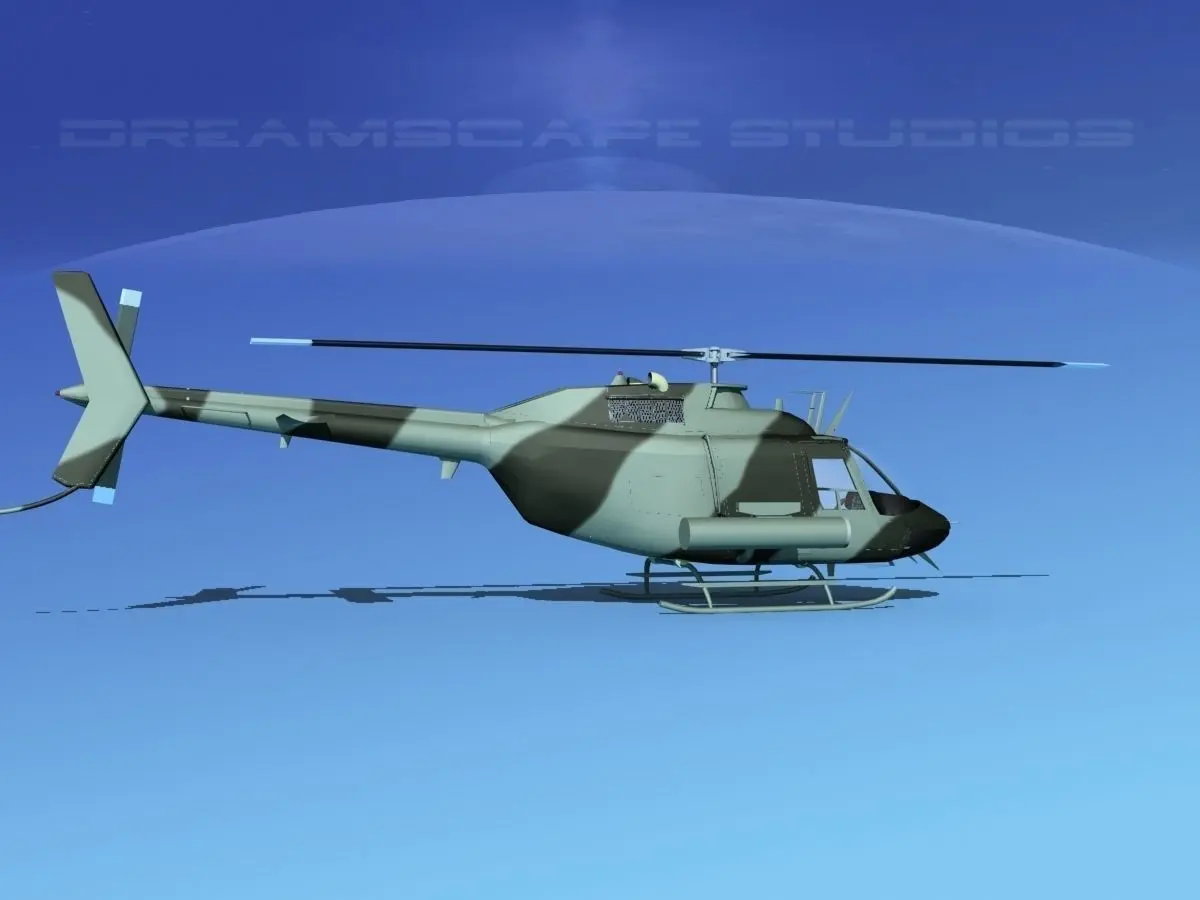 Bell OH-58B Covert 1 This model was originally built in Max 13 near to scale (within 3-4% of scale) and fully textured. It comes with all the materials and textures shown in renderings here. It is available in several formats for a wide variety of end users. This model comes with many different liveries. It is built to be used in in-flight or airport ground animations and video or simulation. It can also be used to populate an airport scene. The model has animated rotor and tail-rotor. The cockpit is semi detailed including control yoke, cyclic, rudder pedals, seating and instrument panel and armored seat panels.