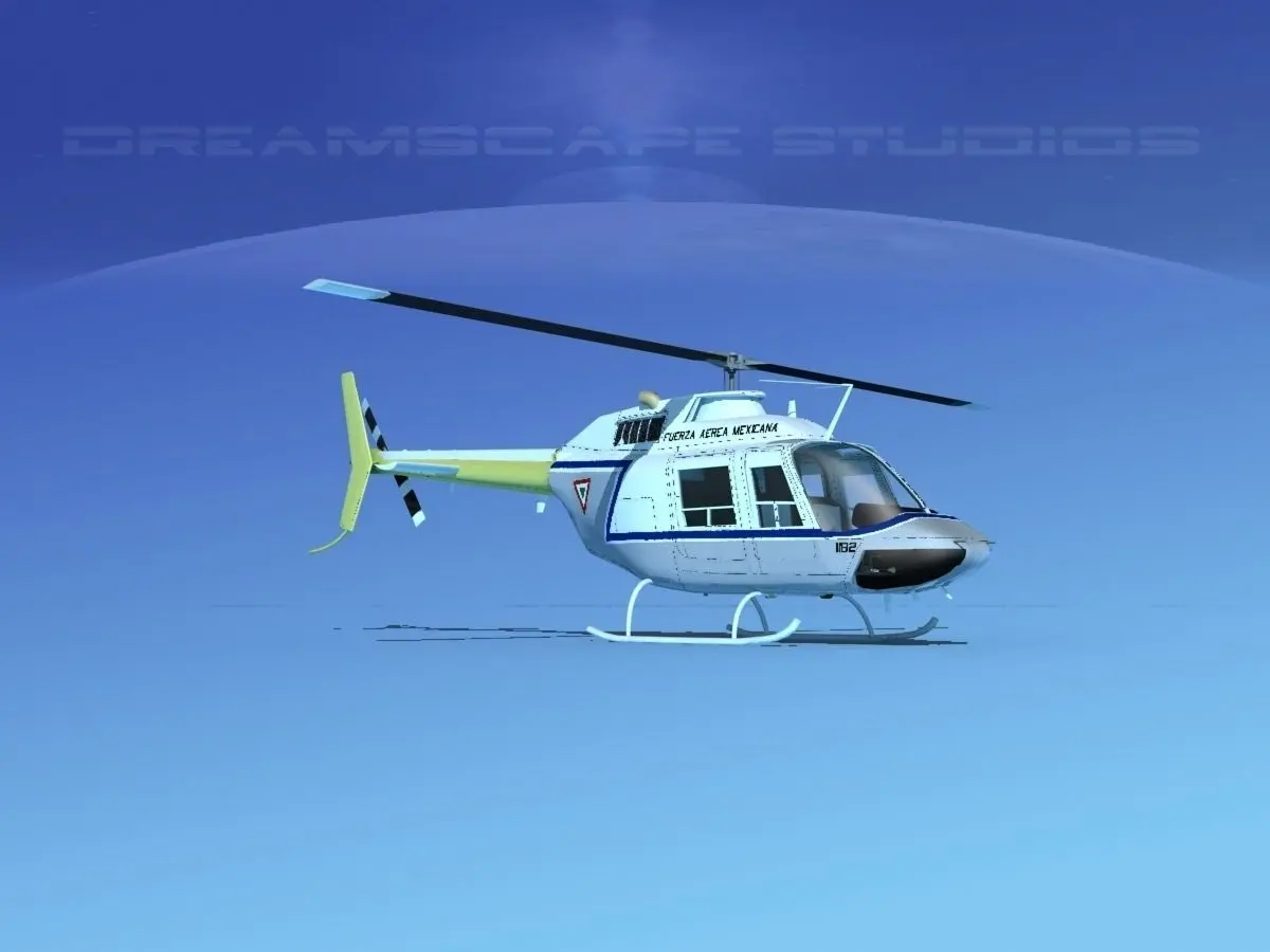 Bell OH-58B Mexican Air Force 2 This model was originally built in Max 13 near to scale (within 3-4% of scale) and fully textured. It comes with all the materials and textures shown in renderings here. It is available in several formats for a wide variety of end users. This model comes with many different liveries. It is built to be used in in-flight or airport ground animations and video or simulation. It can also be used to populate an airport scene. The model has animated rotor and tail-rotor. The cockpit is semi detailed including control yoke, cyclic, rudder pedals, seating and instrument panel and armored seat panels.